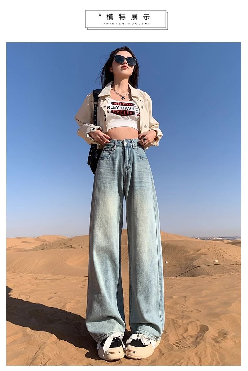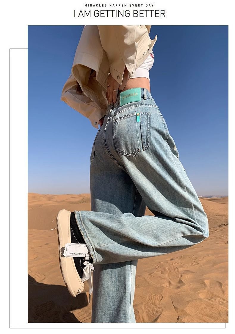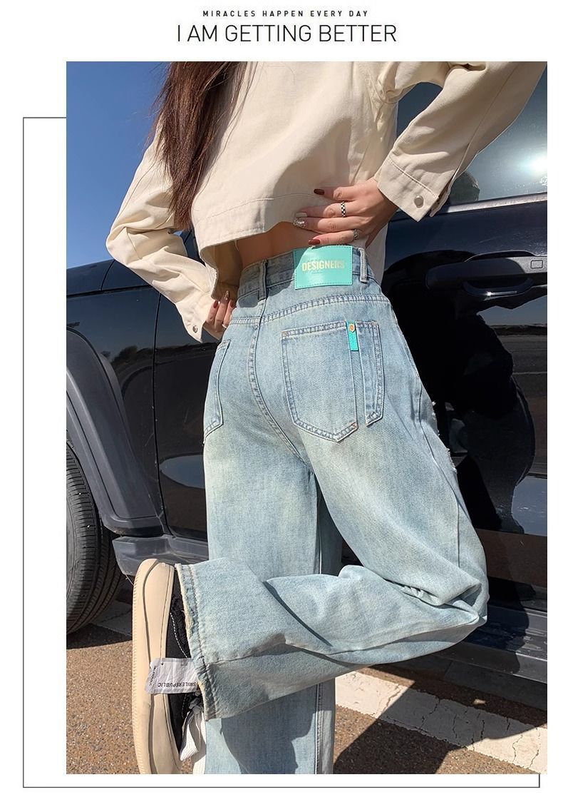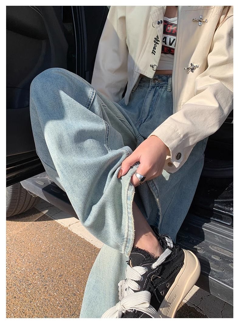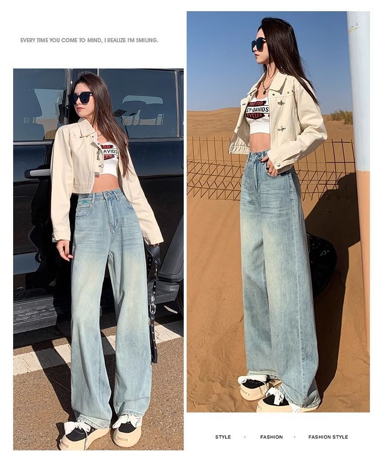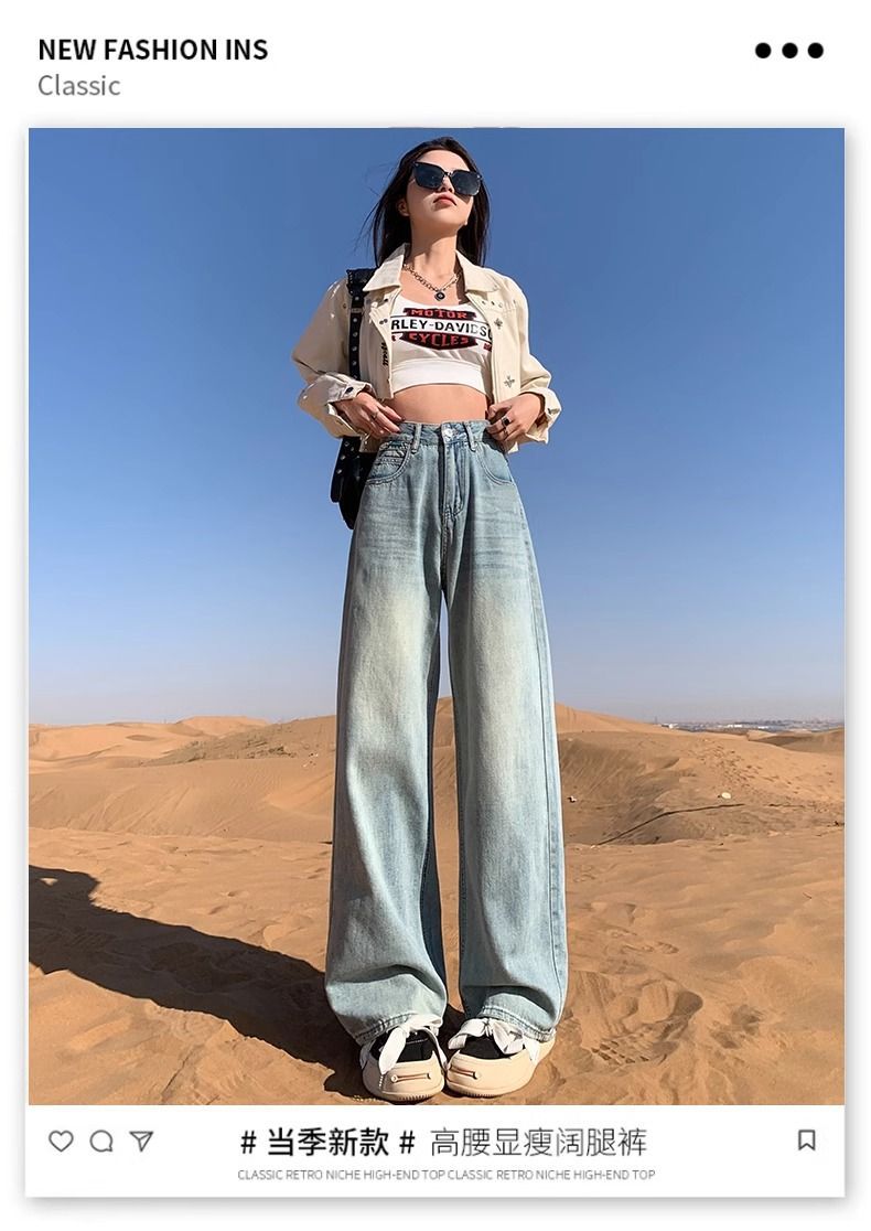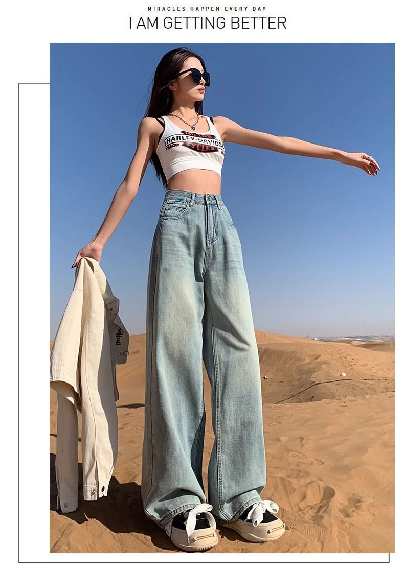 밝은 색 넓은 다리 청바지 여성의 2025 년 여름 봄 높은 허리 느슨한 스트레이트 배 모양의 그림 디자인-센스 트레일 링 바지스토어 가기