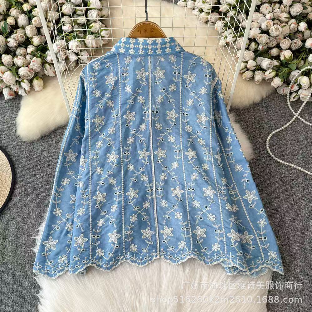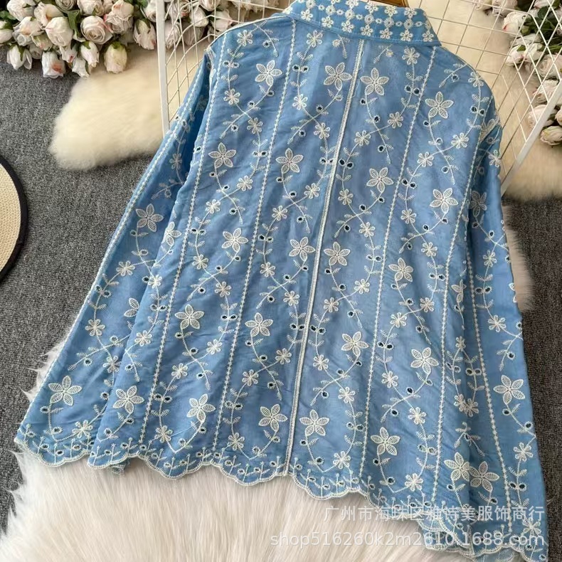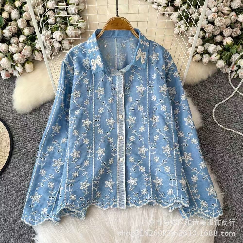 새로운 스타일 부드러운 스타일 자수 꽃 폴로 칼라 셔츠 여성의 겨울 서양식 시대 감소 느슨한 빈 긴 소매 최고 트렌디