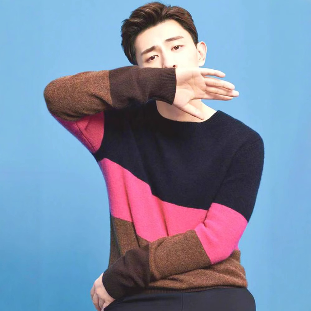 스타 같은 스타일 남자의 겨울 새로운 풀오버 크루 넥 기모 두꺼운 컬러 매칭 스트라이프 긴 소매 스웨터 트렌디 남성