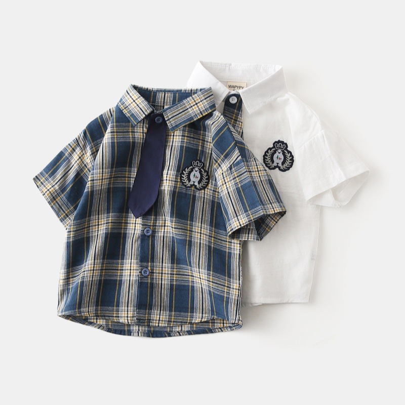 2025 여름 아동복 도매 소년 반팔 셔츠 어린이 격자 무늬 셔츠 아기 흰색 작은 셔츠 조수 생성 머리카락