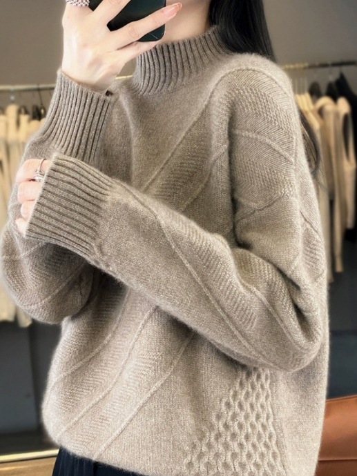 2024 가을과 겨울을위한 여성 하프 터틀넥 스웨터 새로운 패션 간단한 게으른 두꺼운 내부 루즈베이스 셔츠 트렌디스토어 가기