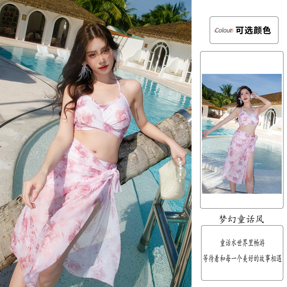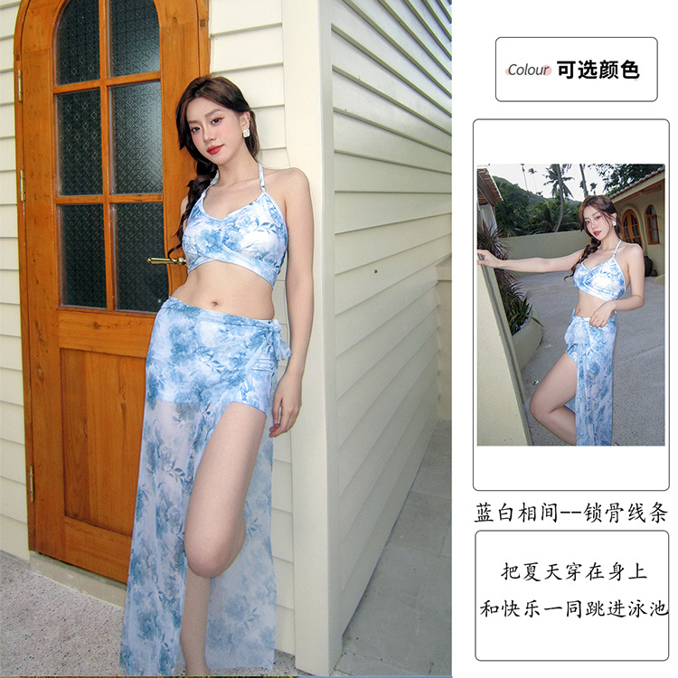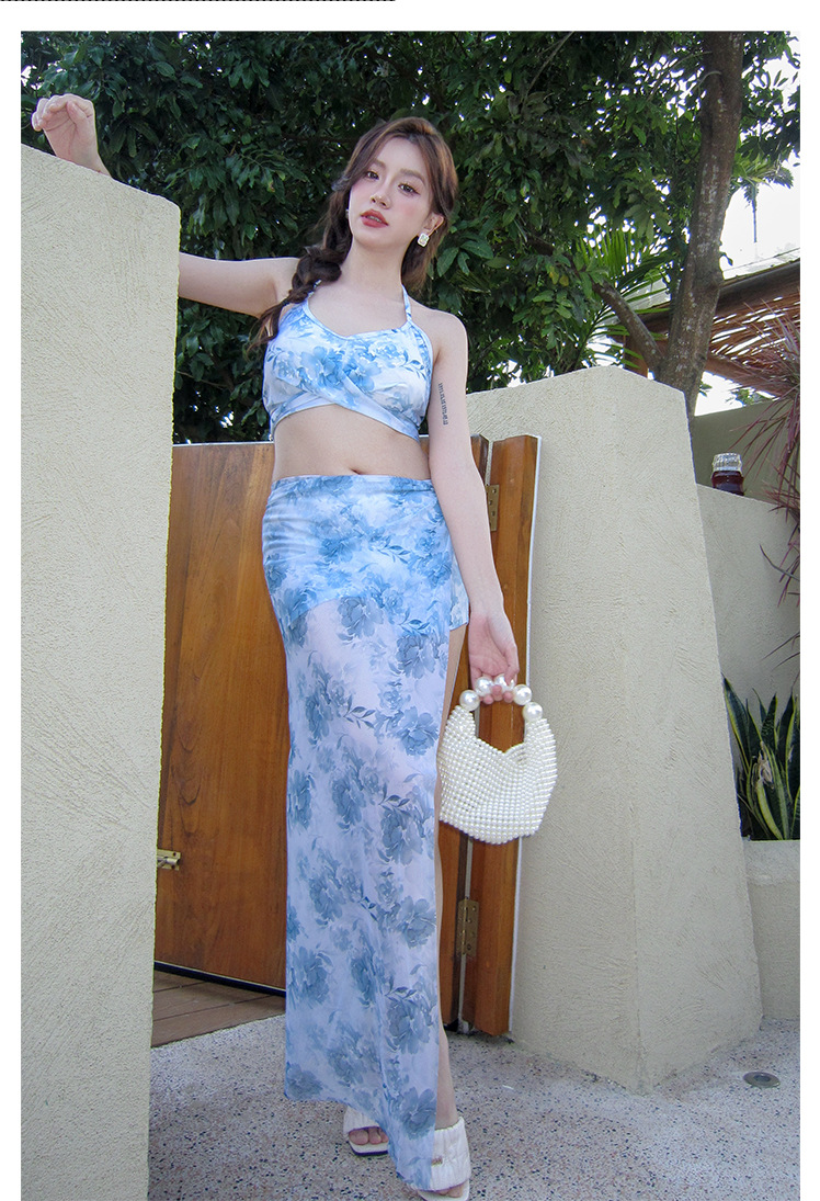 새로운 쇄골 긴 원피스 수영복 여성 해변 휴일 비키니 인쇄 3 피스 틈새 하이 엔드 온천 수영복