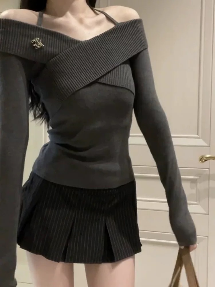 Mu Zi Love 오프 숄더 넥 레이스 업 니트 스웨터 여성 가을 및 겨울 슬림 핏 순수한 욕망 스타일 스웨터베이스 셔츠 탑 디자인 감각