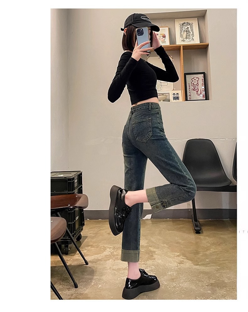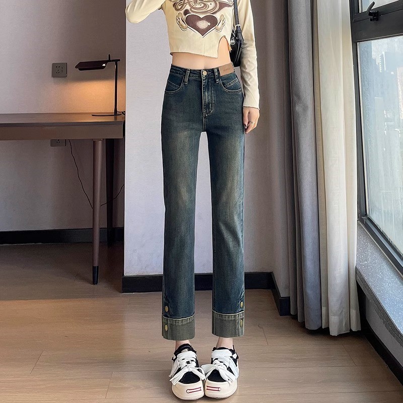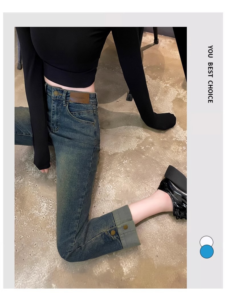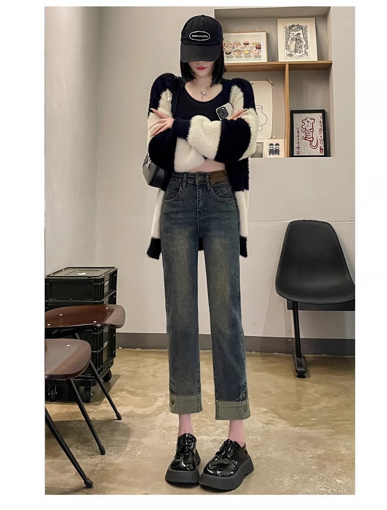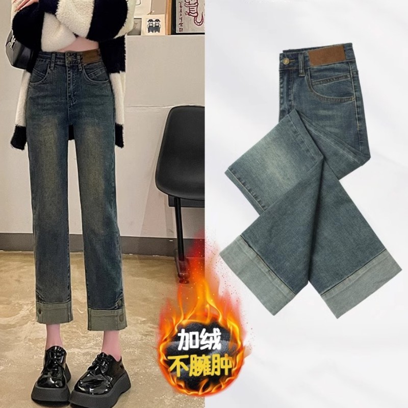 기모 두꺼운 담배 튜브 청바지 여성의 가을과 겨울 유행 모든 경기 새로운 도착 높은 허리 자른 스트레이트 바지스토어 가기