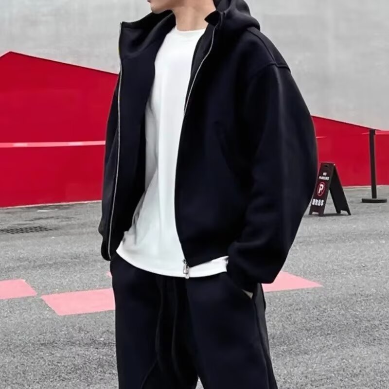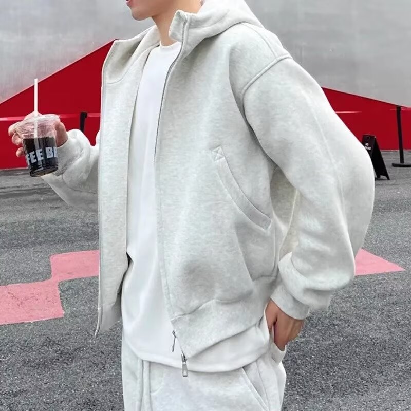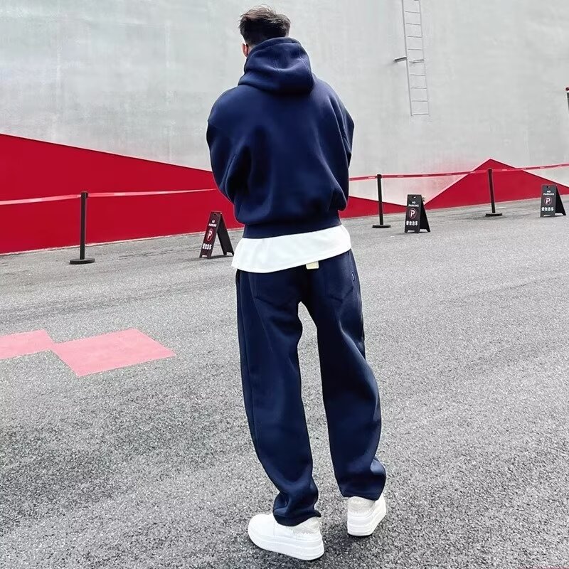 남성 가을과 겨울 기모 캐주얼 스포츠 세트 남성 아메리칸 스타일 패션 브랜드 루즈 후드 재킷 스웨트 팬츠 2 피스 세트스토어 가기