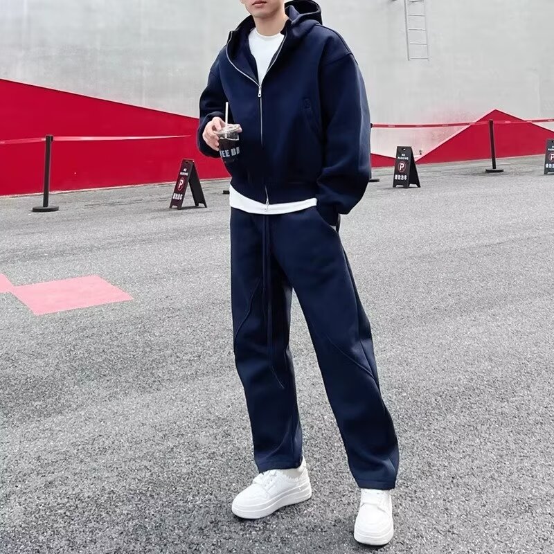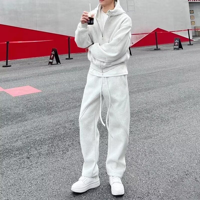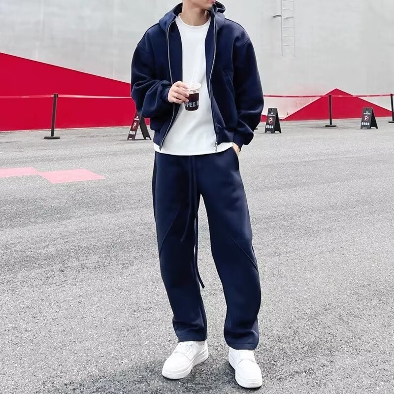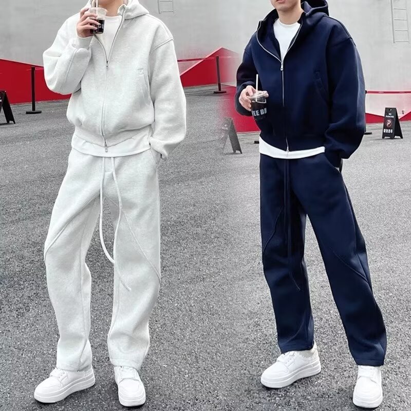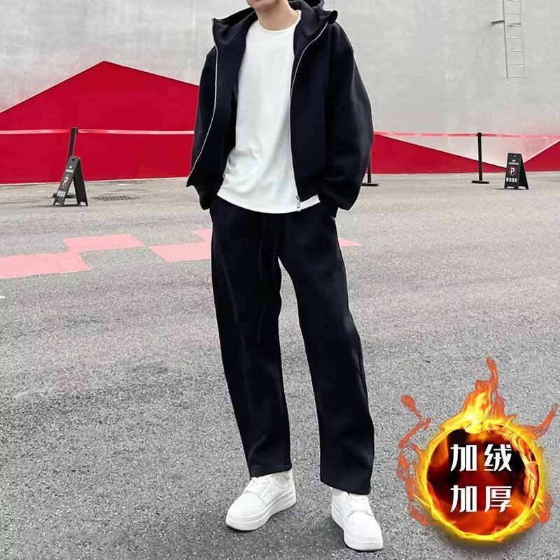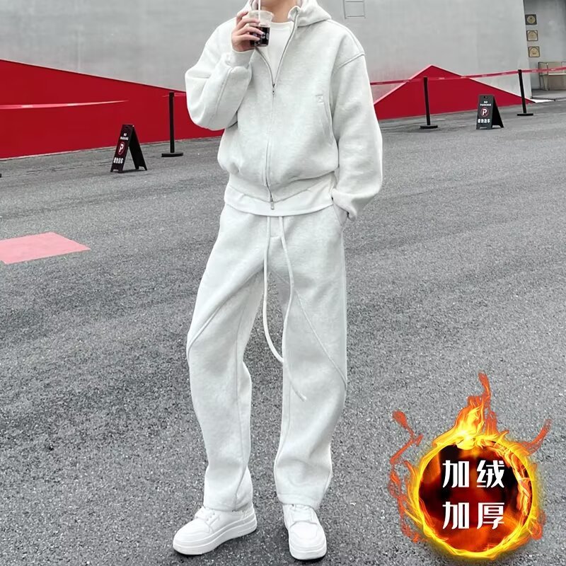 남성 가을과 겨울 기모 캐주얼 스포츠 세트 남성 아메리칸 스타일 패션 브랜드 루즈 후드 재킷 스웨트 팬츠 2 피스 세트