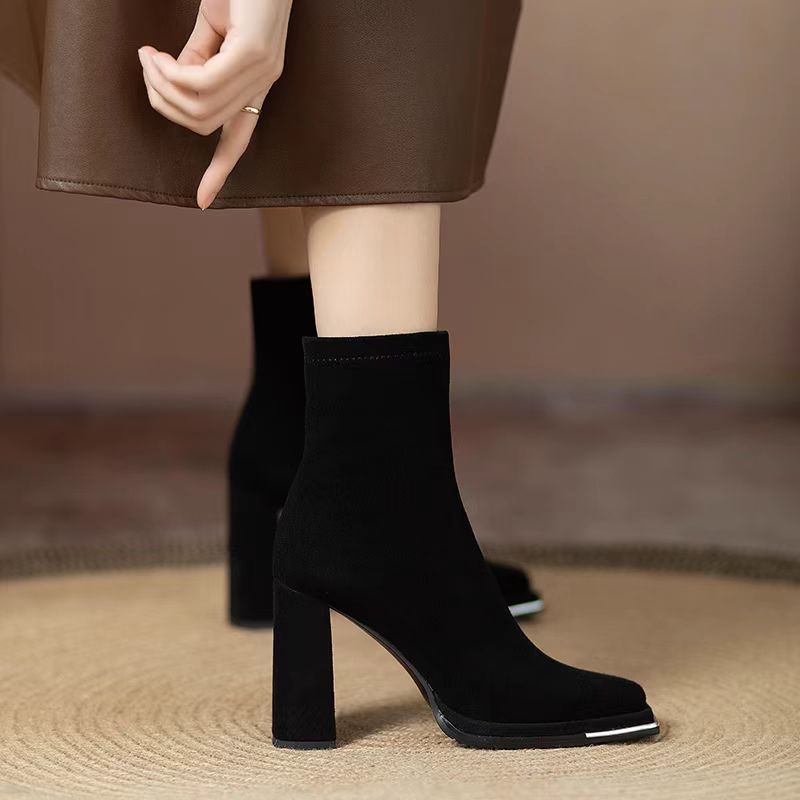 스퀘어 헤드 스키니 부츠 사이드 지퍼 청키 힐 발목 부츠 영국 봄 가을 싱글 부츠 하이힐 마틴 부츠 기모 여성용 부츠