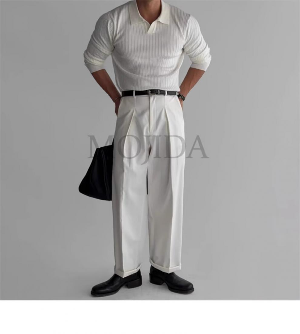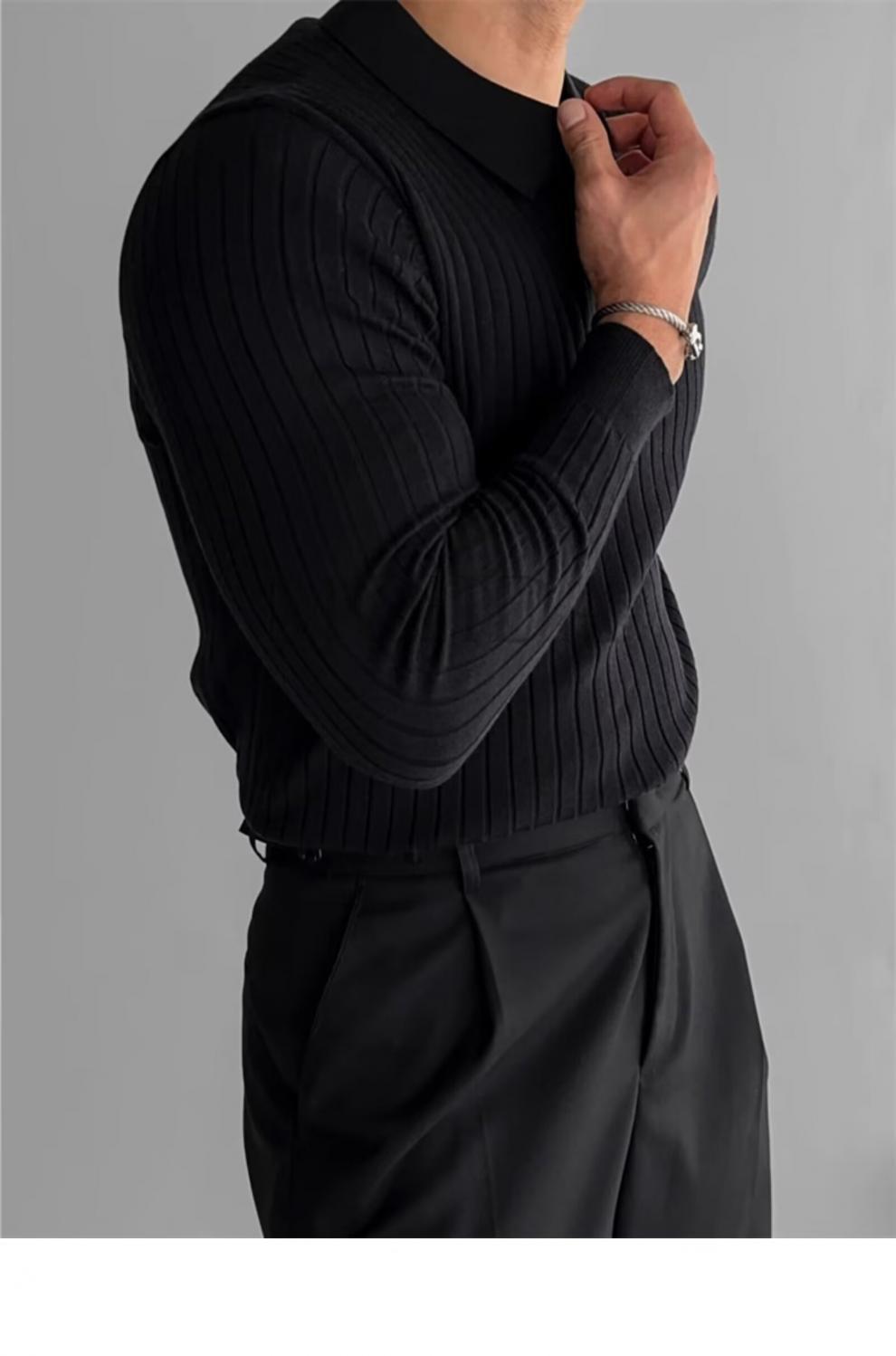 봄과 가을 니트 의류 남성 크로스 보더 솔리드 컬러 스웨터 스트라이프 탄성 옷깃 풀오버 폴로 셔츠 긴팔 티셔츠