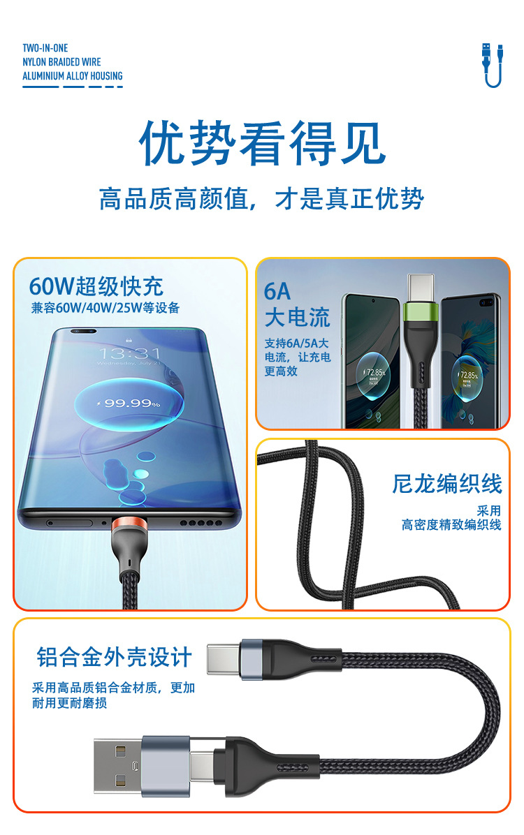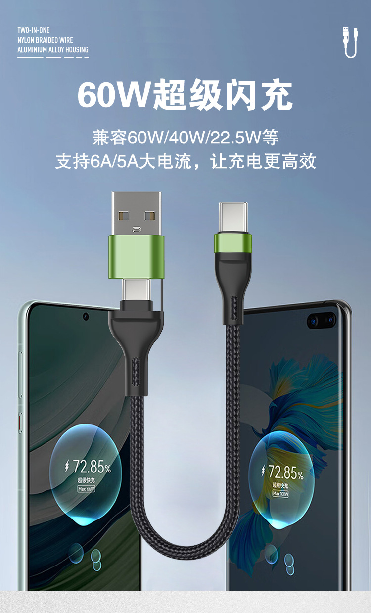 Typec Huawei 휴대폰 충전 케이블에 적합한 1:2 초고속 충전 데이터 케이블 짧은 휴대용 케이블