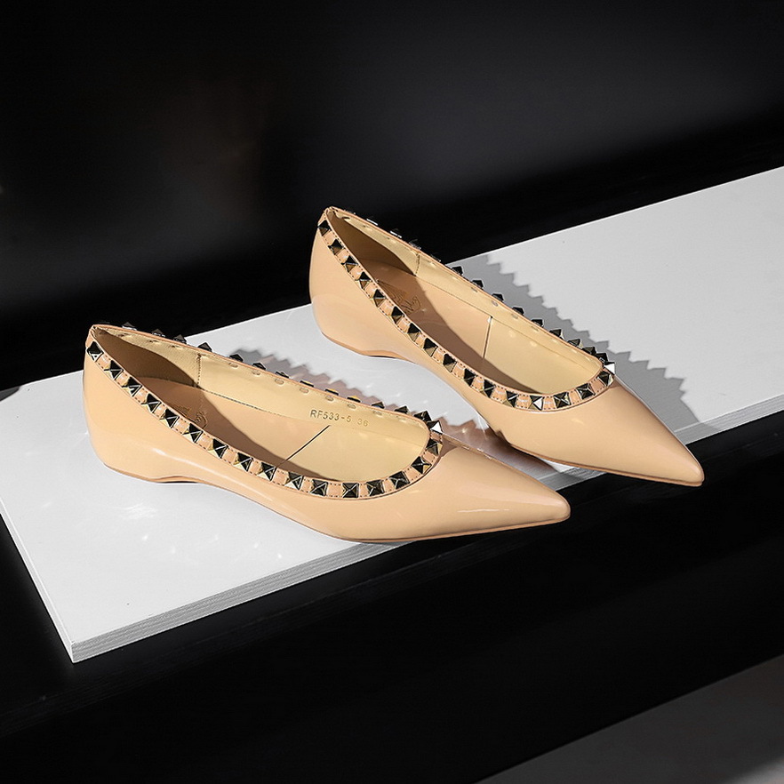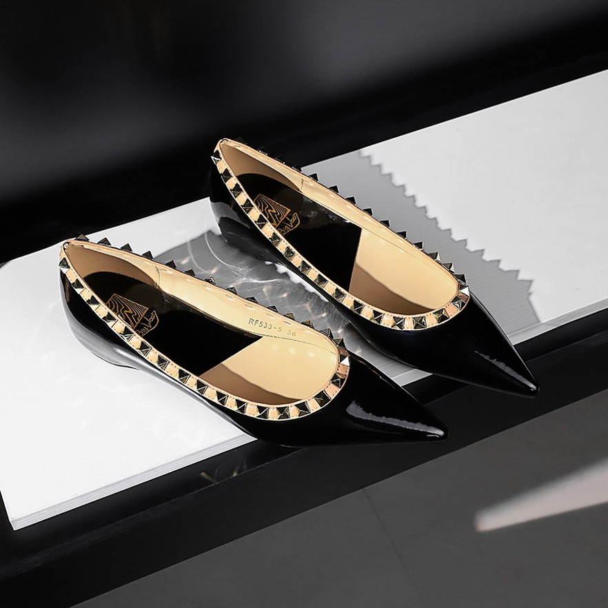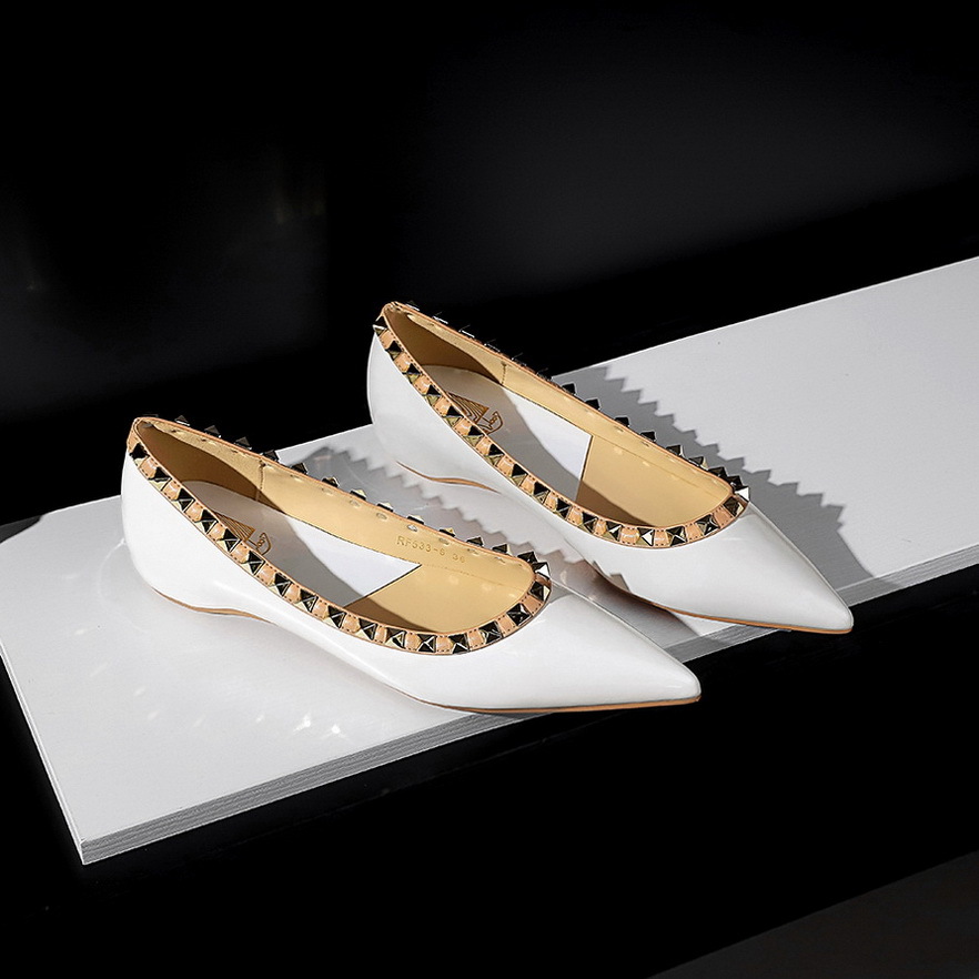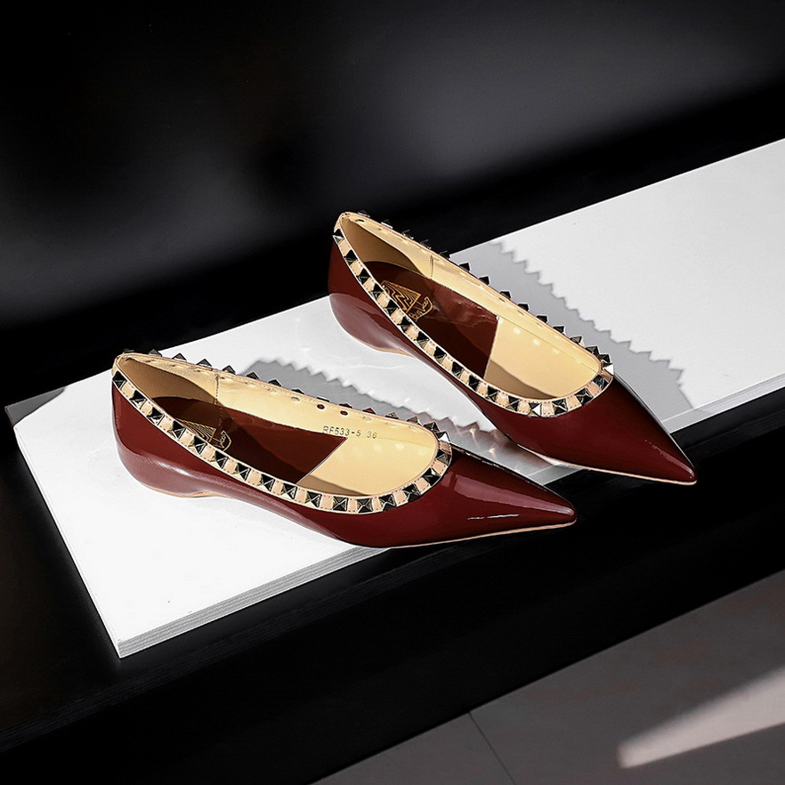 577-5 유럽과 미국의 여성 신발 웨지 로우 힐 조커 편안한 내부 높이 특허 가죽 얕은 입 뾰족한 금속 리벳 싱글 신발