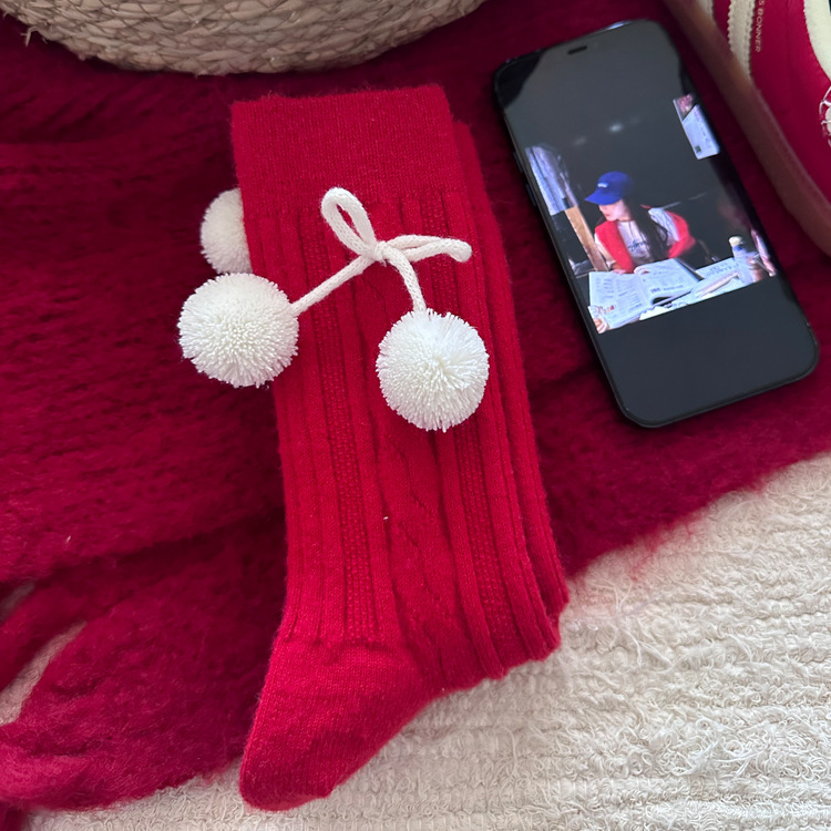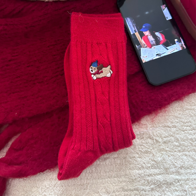 봉제 Benmingnian Red Socks 여성용 가을과 겨울은 뱀 새해의 따뜻한 해에 기모 두꺼운 수면 바닥 겨울 스타킹스토어 가기