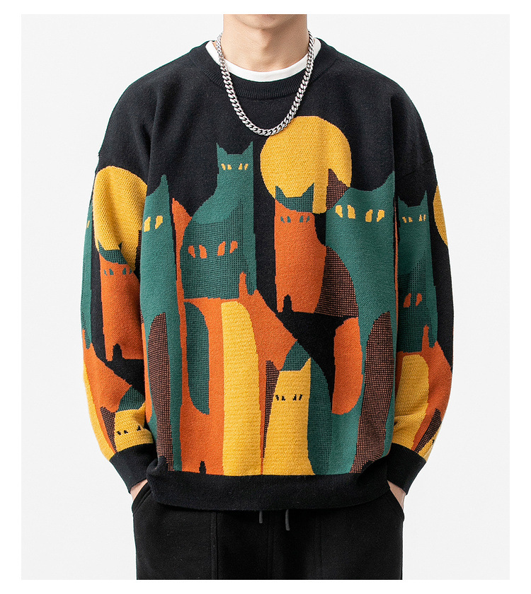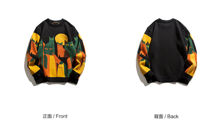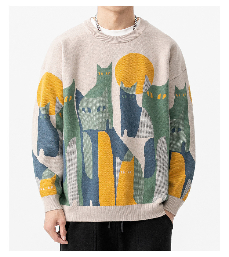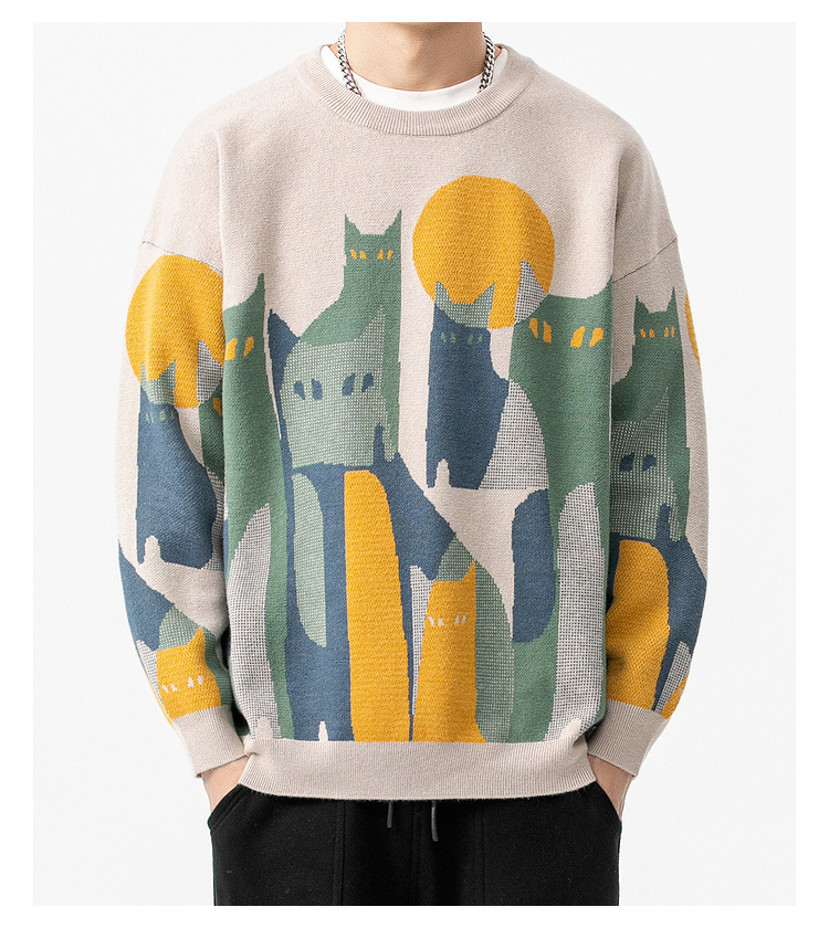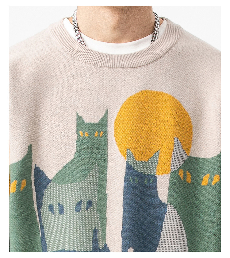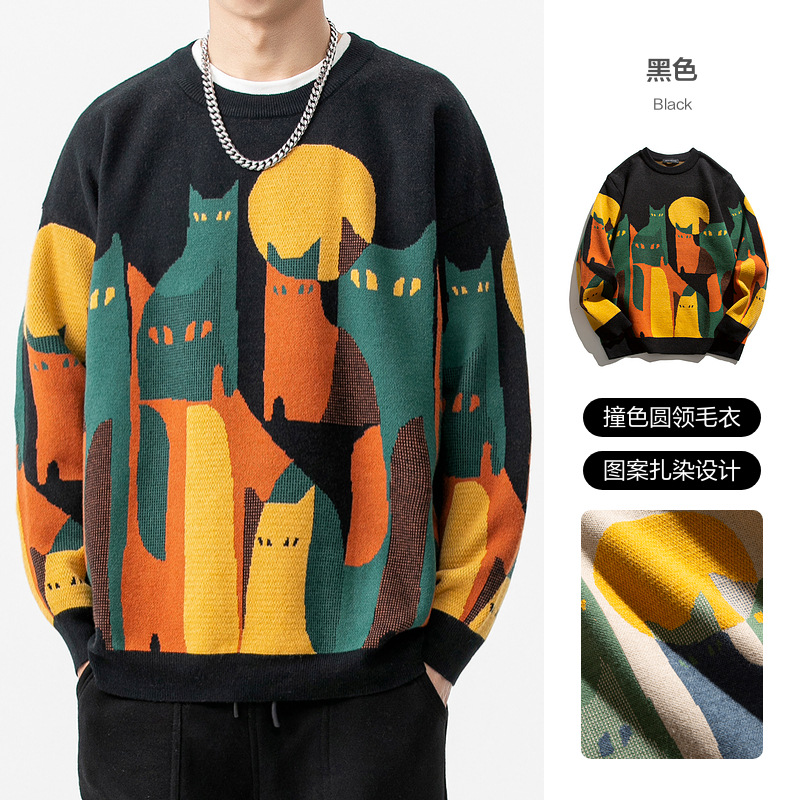 원래 수제 일본 패션 브랜드 창조적 인 고양이 패턴 크루 넥 스웨터 남자 가을 느슨한 탑 니트 셔츠 학생스토어 가기