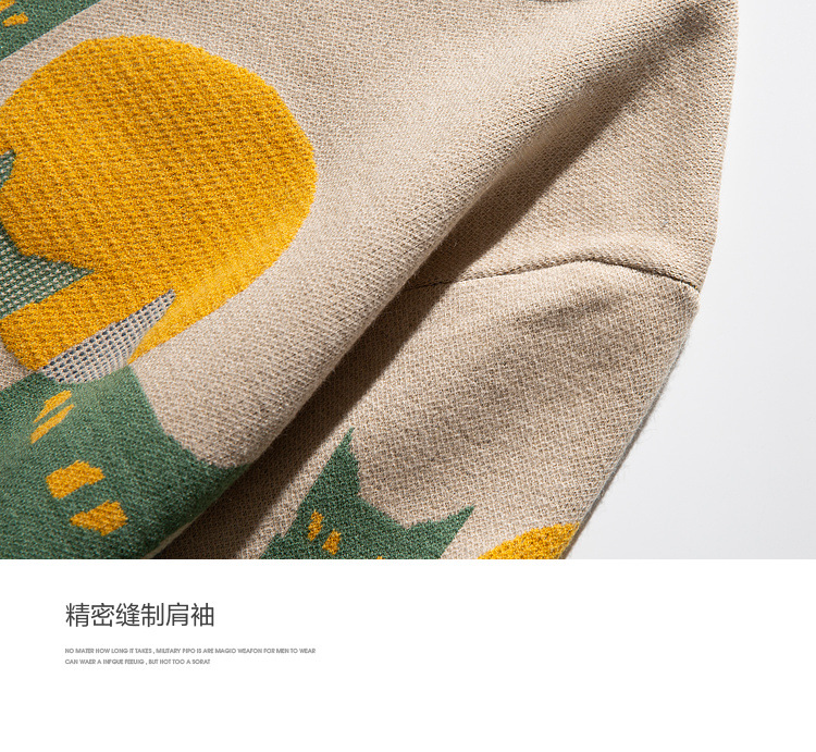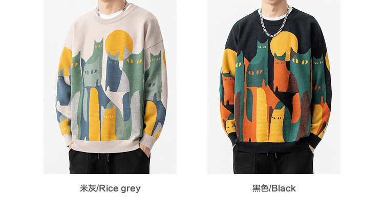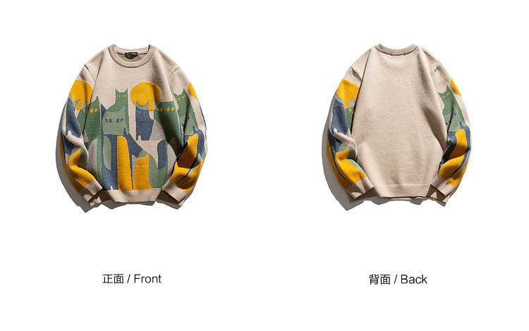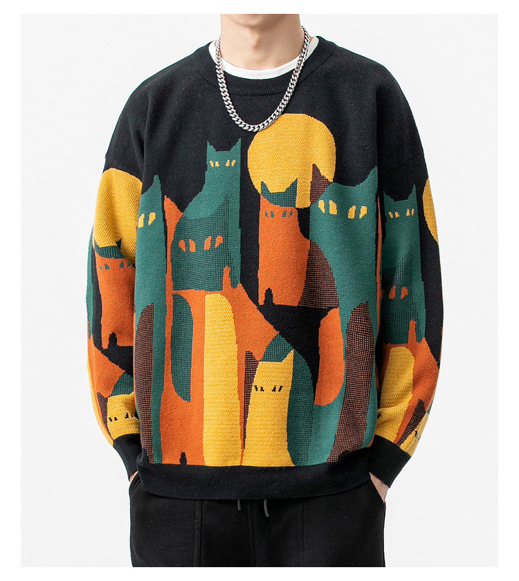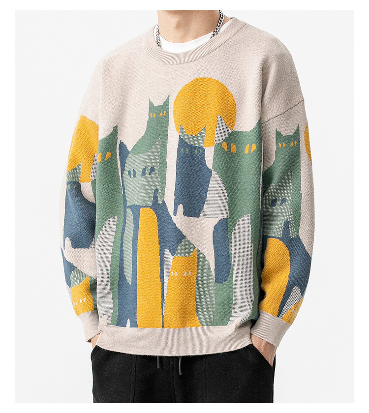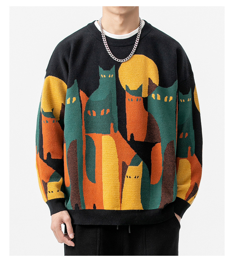 원래 수제 일본 패션 브랜드 창조적 인 고양이 패턴 크루 넥 스웨터 남자 가을 느슨한 탑 니트 셔츠 학생스토어 가기
