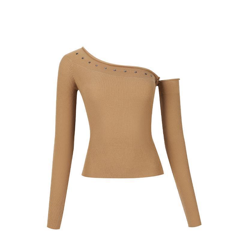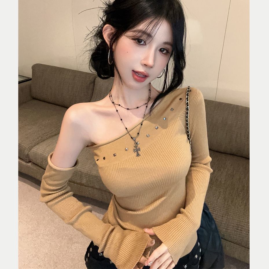 2024 년 가을과 겨울 새로운 티셔츠 풀업 하트 공격 슬랜트 숄더 쇼트 탑 한국 스타일 스파이스 걸스 솔리드 컬러 긴 소매베이스 셔츠