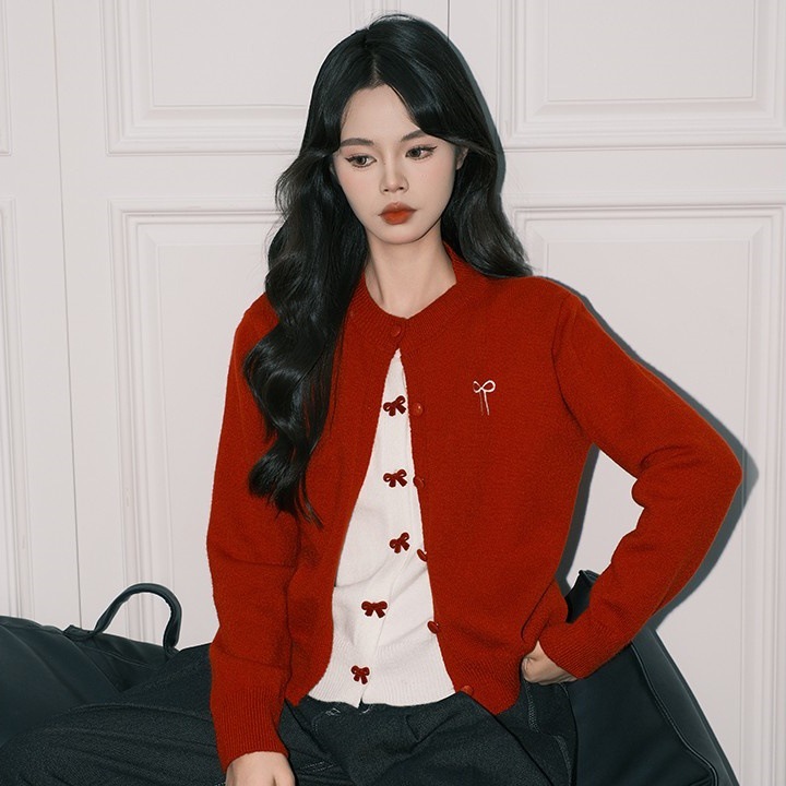 크리스마스 착용 붉은 가짜 투피스 활 스웨터 여성의 가을과 겨울 느슨한 게으른 짧은 니트 재킷