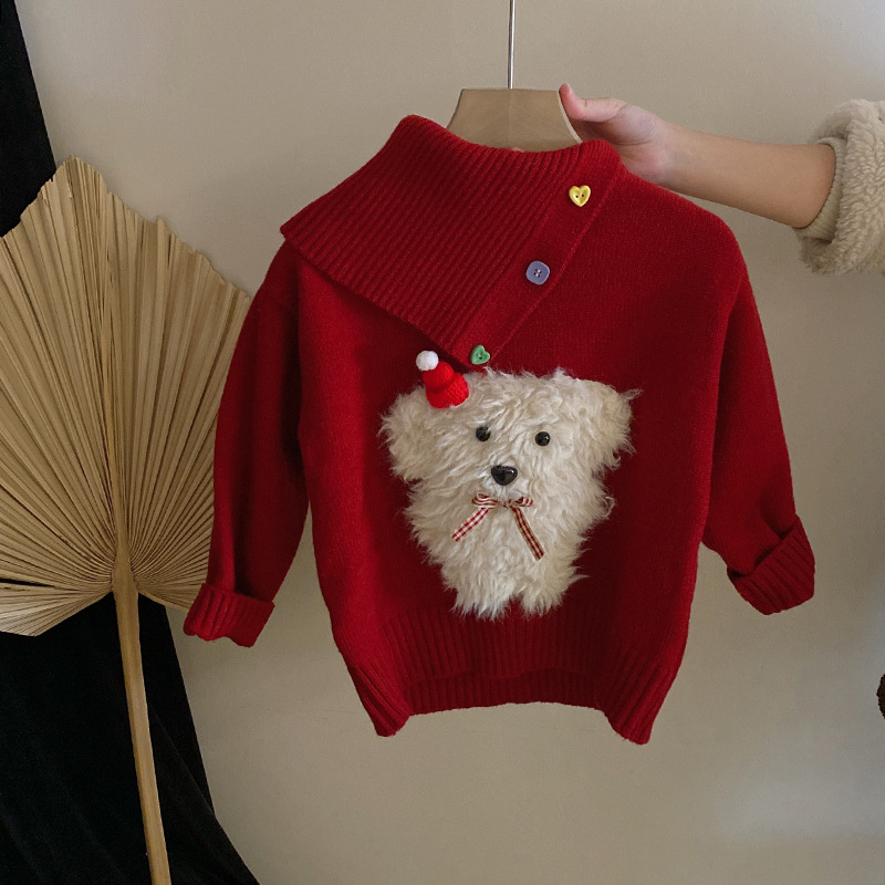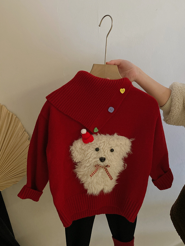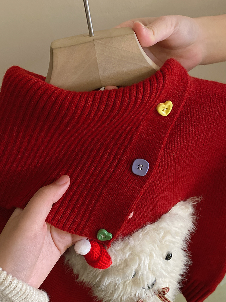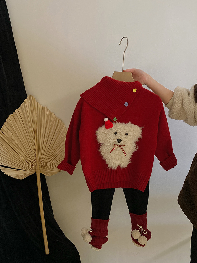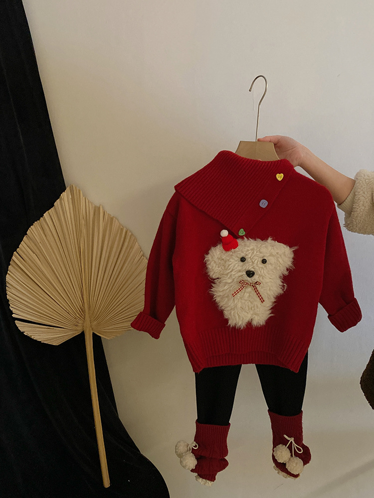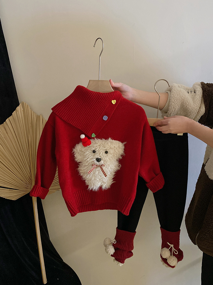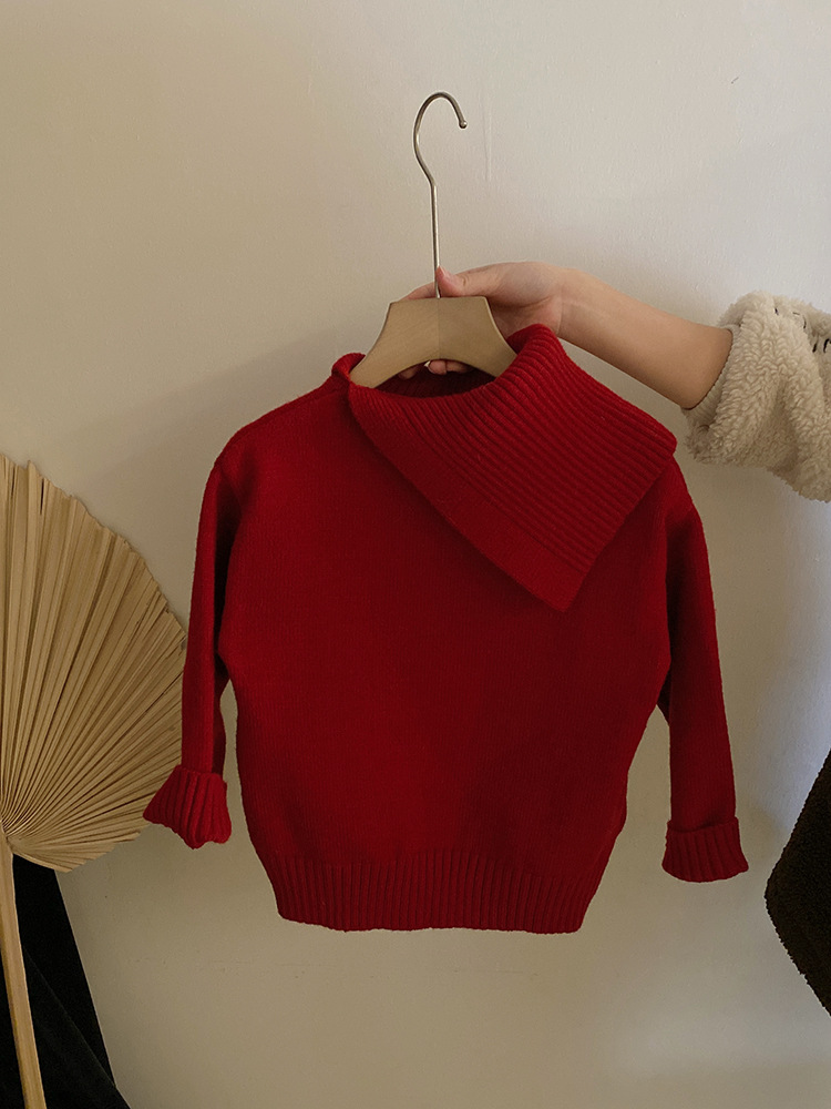 소녀 디자인 감각 옷깃 개 빨간 니트 스웨터 2024 가을과 겨울 새로운 기모 바느질 레깅스 세트스토어 가기