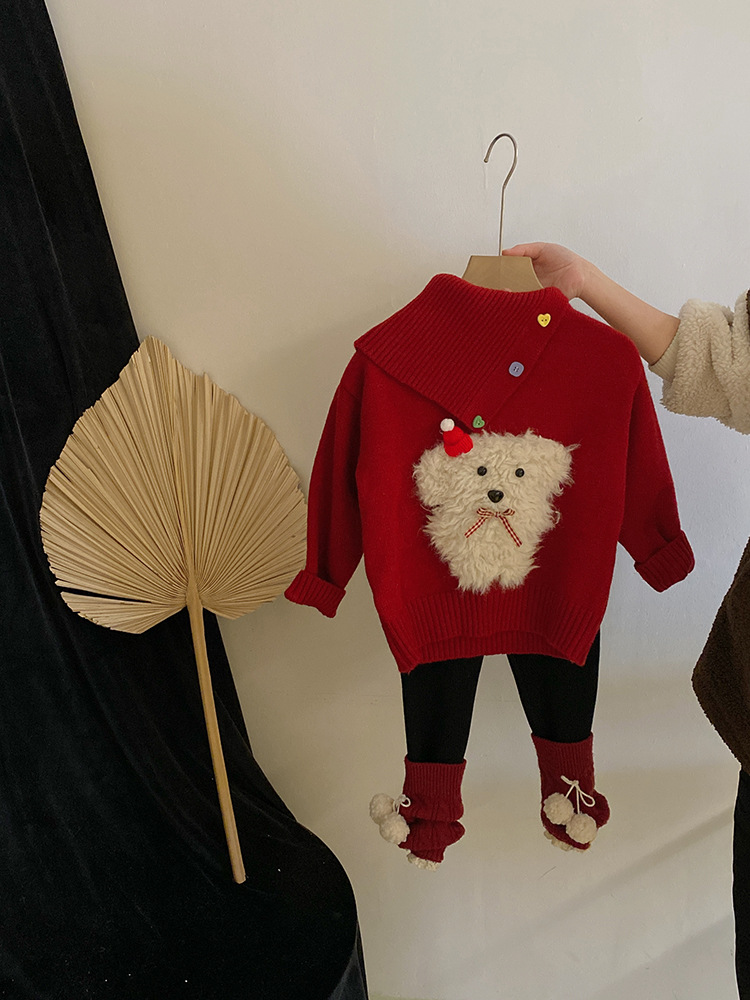 소녀 디자인 감각 옷깃 개 빨간 니트 스웨터 2024 가을과 겨울 새로운 기모 바느질 레깅스 세트