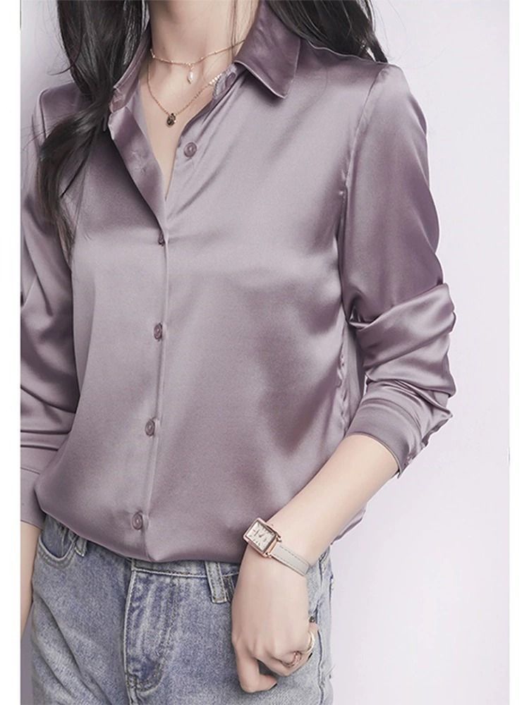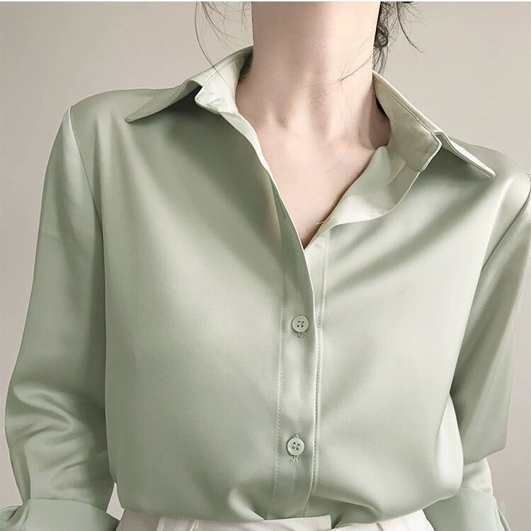 프랑스 슈페리어 사틴 가짜 실크 셔츠 여성용 청바지 최고 2024 느슨한 통근 셔츠