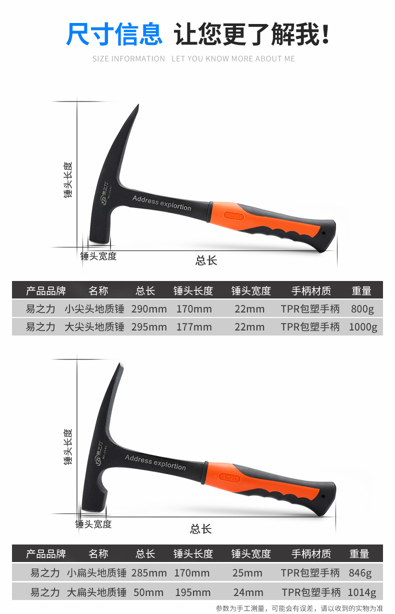 전문 탐사 해머 뾰족한 플랫 헤드 해머 탈출 해머 전문 지질 및 광물 탐사 도구 지질 해머