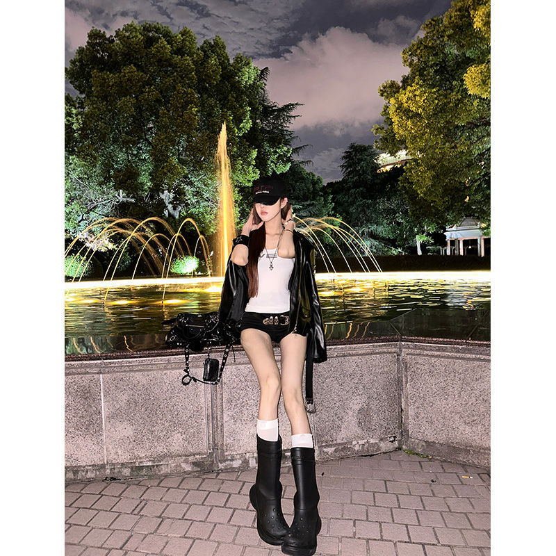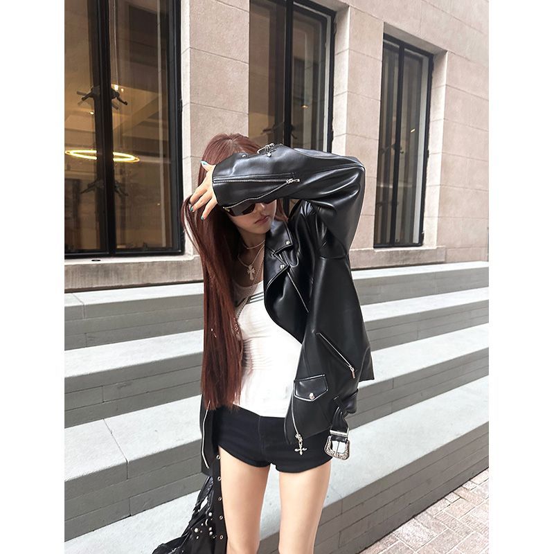봄과 가을 핫걸 디자인 느슨한 중공업 재킷 유행 여성을위한 스트리트 아메리칸 스타일 맞춤형 블랙 가죽 재킷스토어 가기