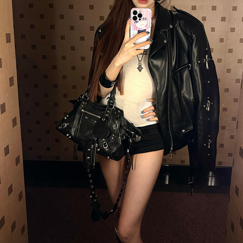 봄과 가을 핫걸 디자인 느슨한 중공업 재킷 유행 여성을위한 스트리트 아메리칸 스타일 맞춤형 블랙 가죽 재킷
