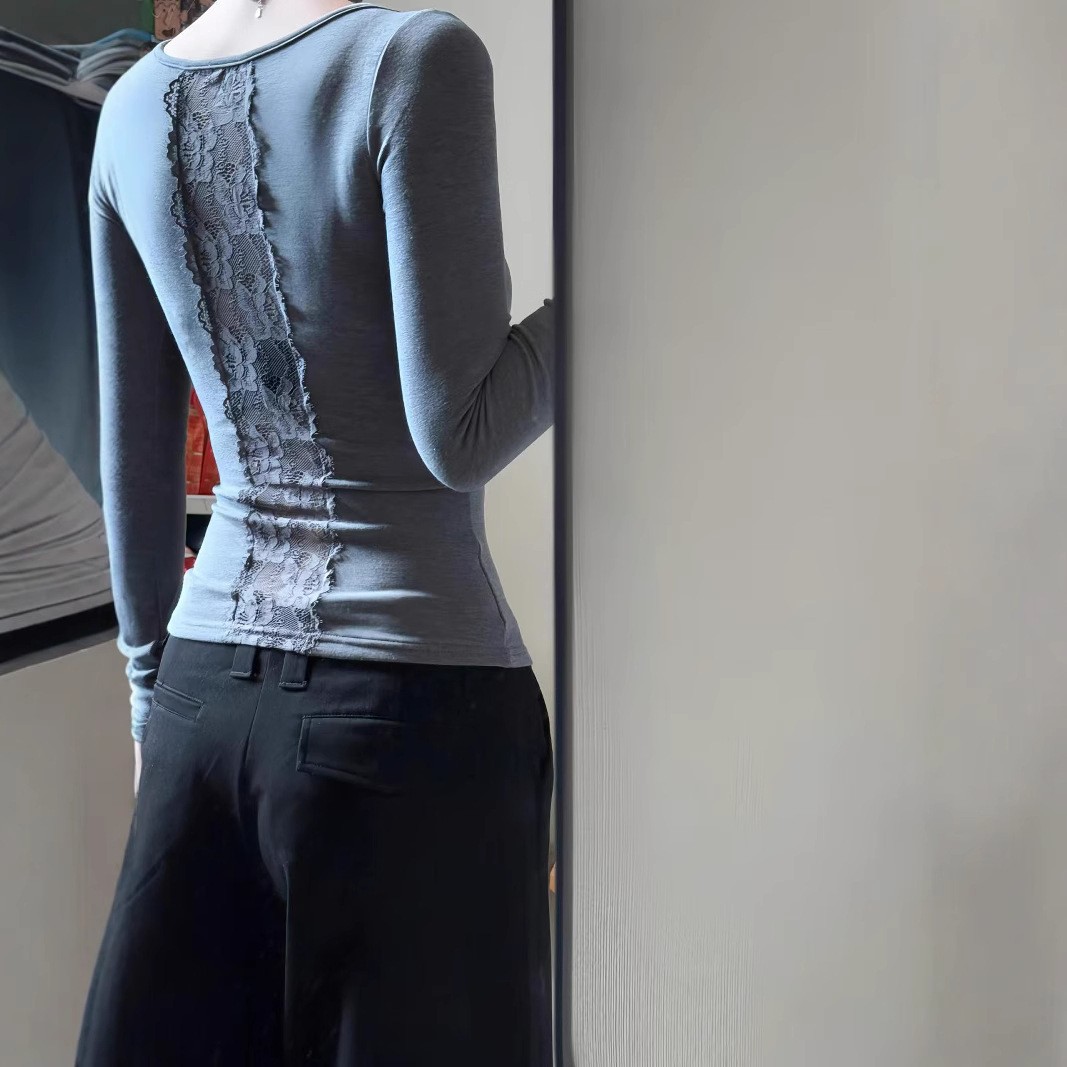 순수한 욕망 레이스 다시 바느질 회색 V-목베이스 셔츠 여성의 가을과 겨울 스파이스 소녀 독특한 긴 소매 탑