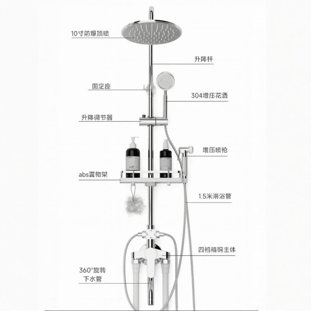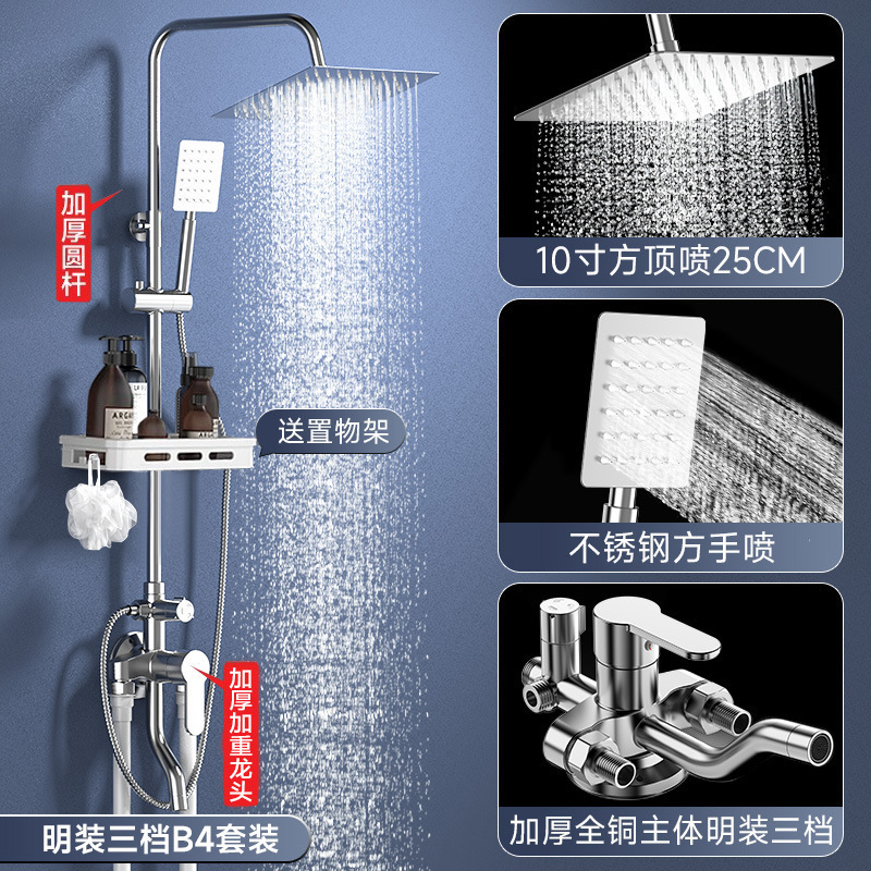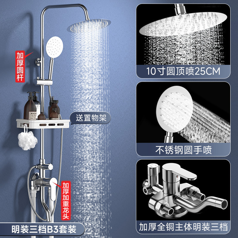 • 노출형 실버◆3단 두꺼운 수도꼭지◆10inch 원형 스테인레스 스틸 핸드탑 스프레이 [수납 선반 포함]