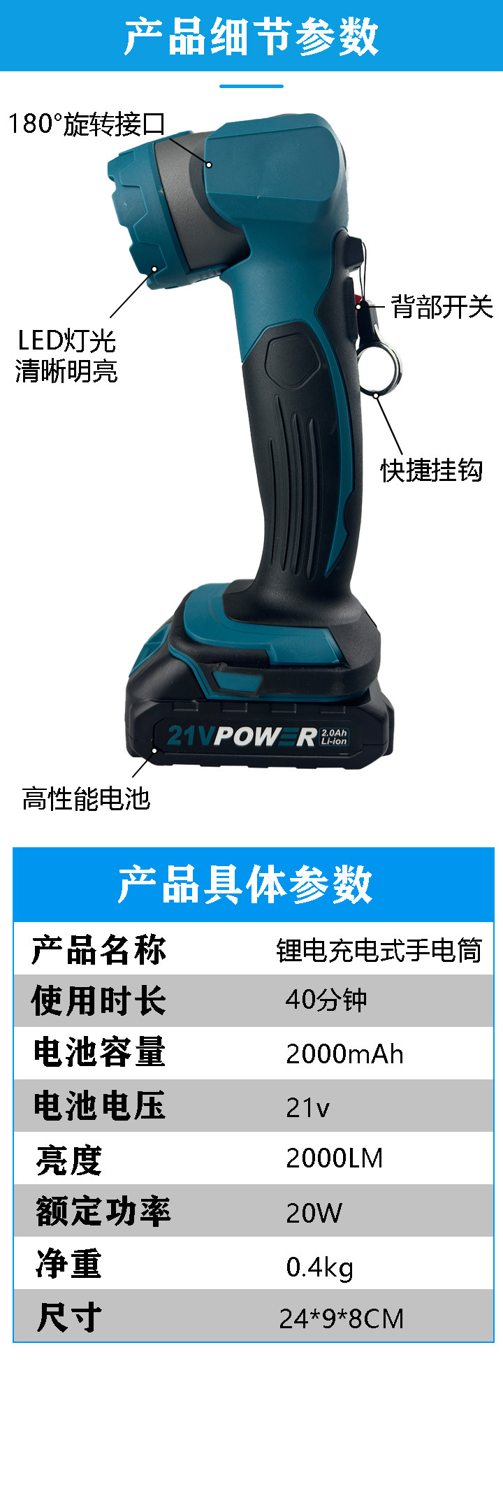 • W98 리튬 배터리 실외 손전등 조명 [블루 10셀 배터리 1개 충전 마키타 모델]