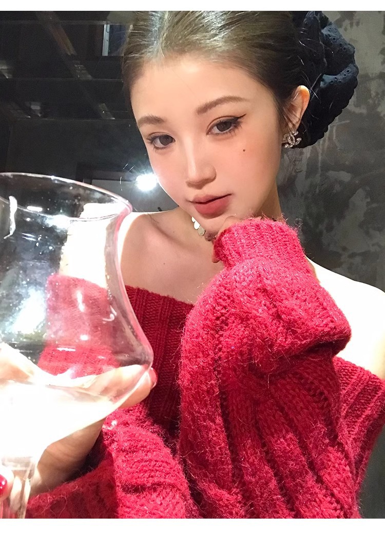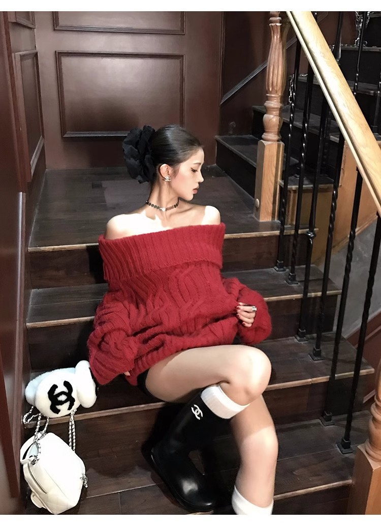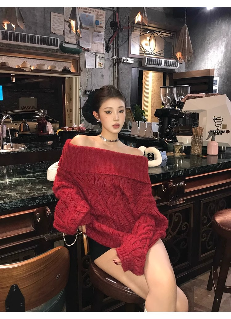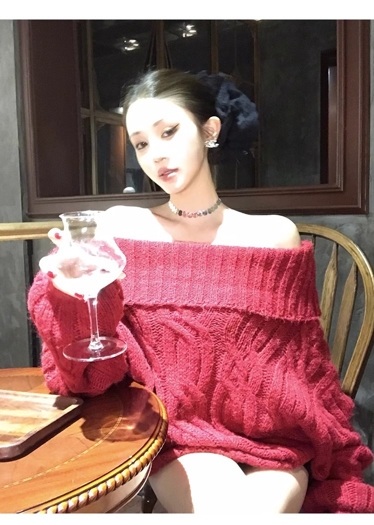 [스페셜 원사] 새해맞이 붉은오프-어깨 트위스트 스웨터 여성 가을 · 겨울 새 니트웨어 게으른 바람