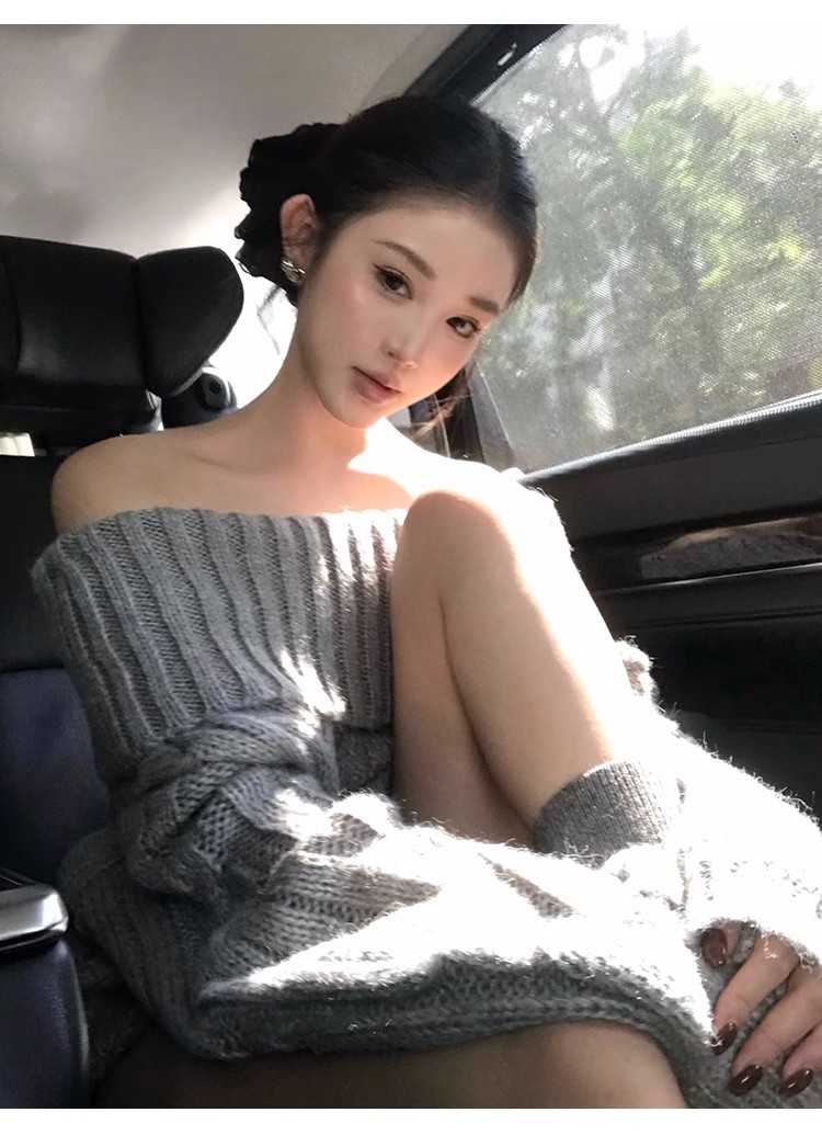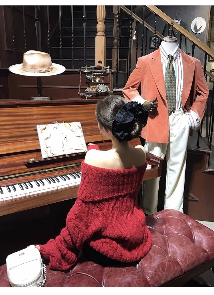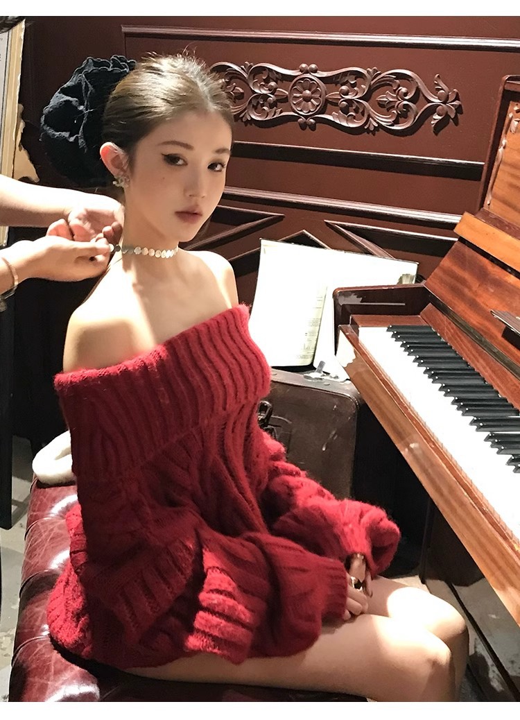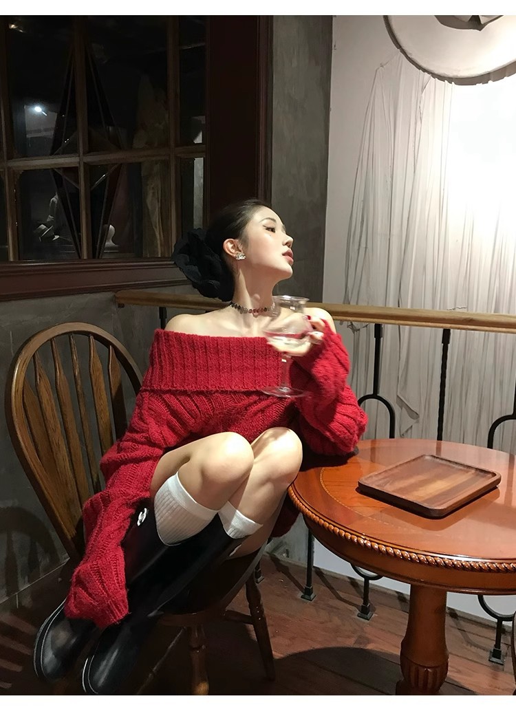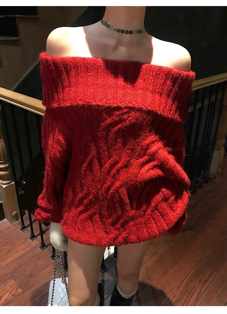 [스페셜 원사] 새해맞이 붉은오프-어깨 트위스트 스웨터 여성 가을 · 겨울 새 니트웨어 게으른 바람