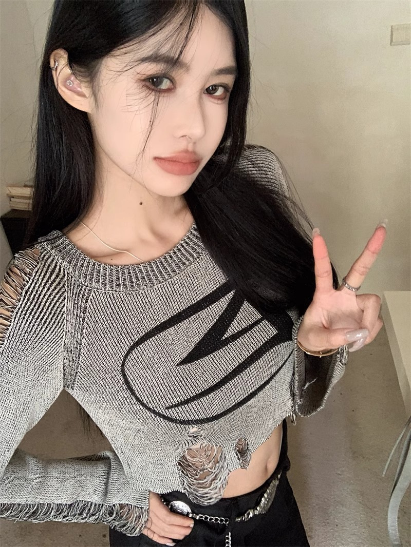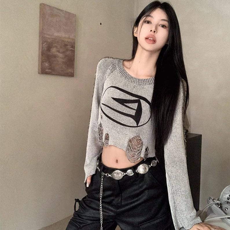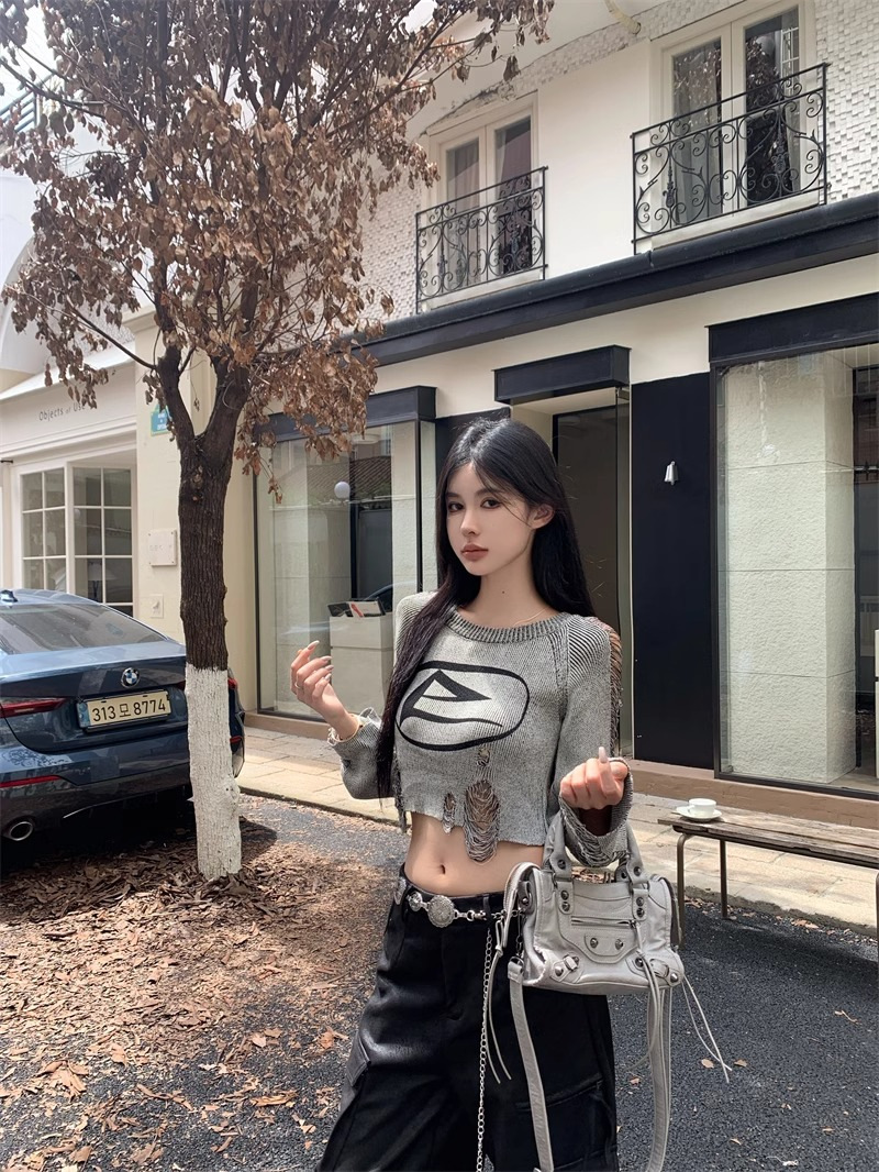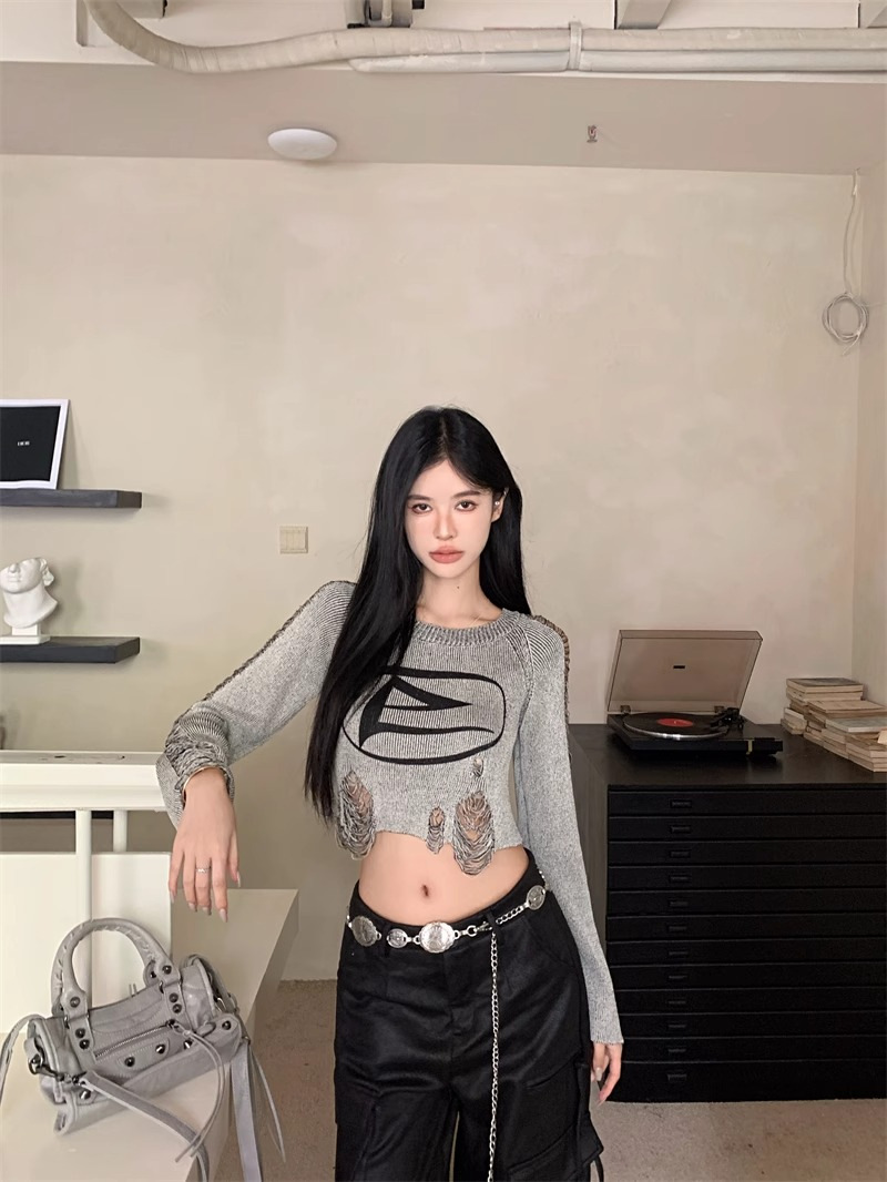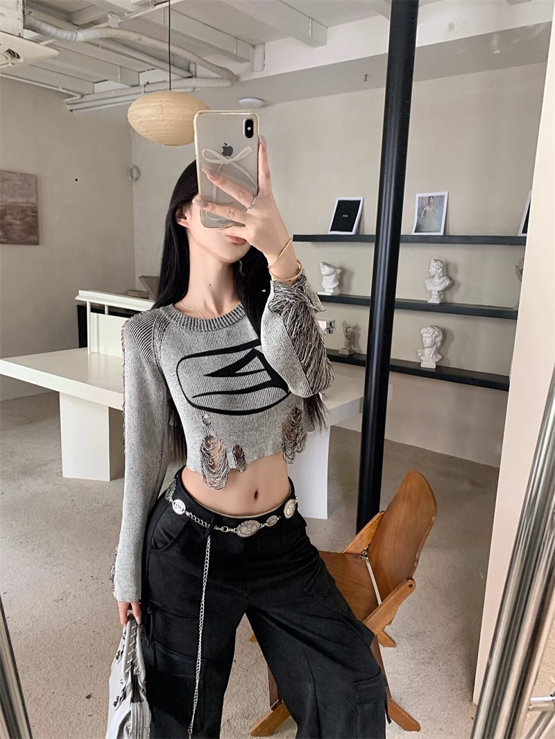 달콤하고 멋진 미국 스타일 레트로 스타일 리핑 브 니트웨어 여성용 가을 짧은 배꼽 노출 Chic Pullover Blouse Top스토어 가기