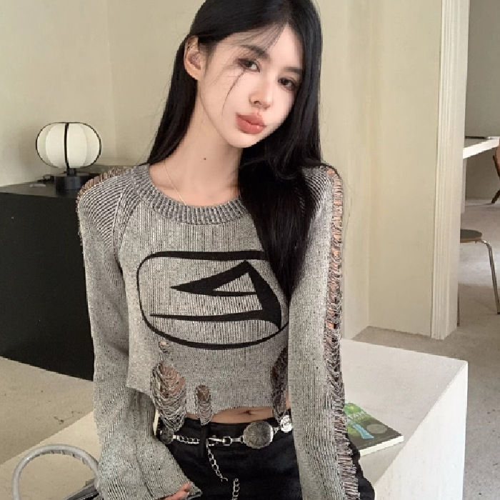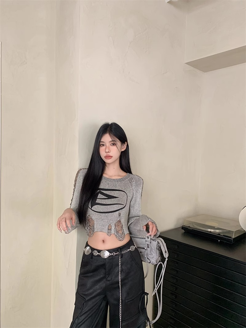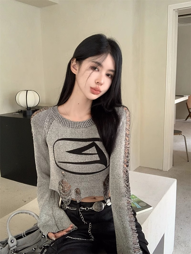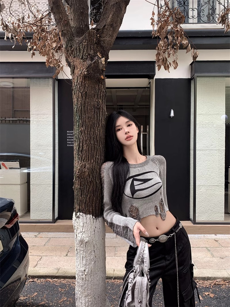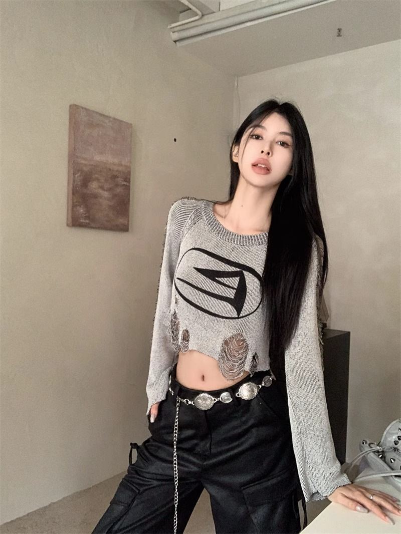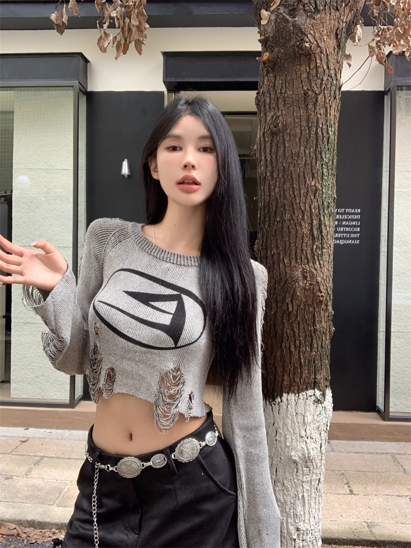 달콤하고 멋진 미국 스타일 레트로 스타일 리핑 브 니트웨어 여성용 가을 짧은 배꼽 노출 Chic Pullover Blouse Top스토어 가기