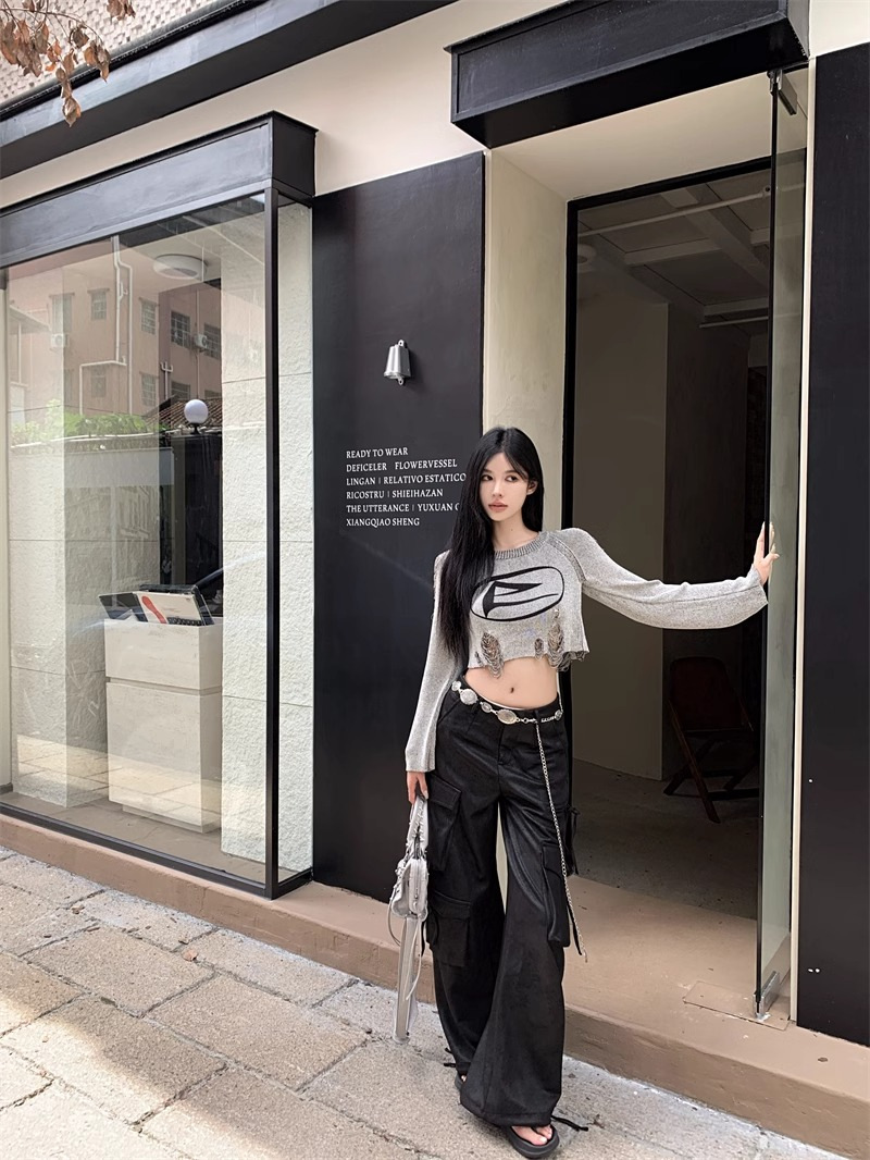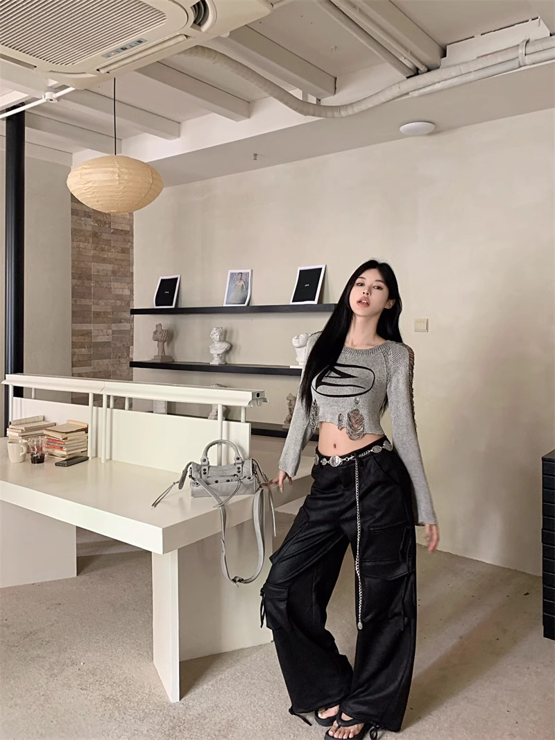 달콤하고 멋진 미국 스타일 레트로 스타일 리핑 브 니트웨어 여성용 가을 짧은 배꼽 노출 Chic Pullover Blouse Top