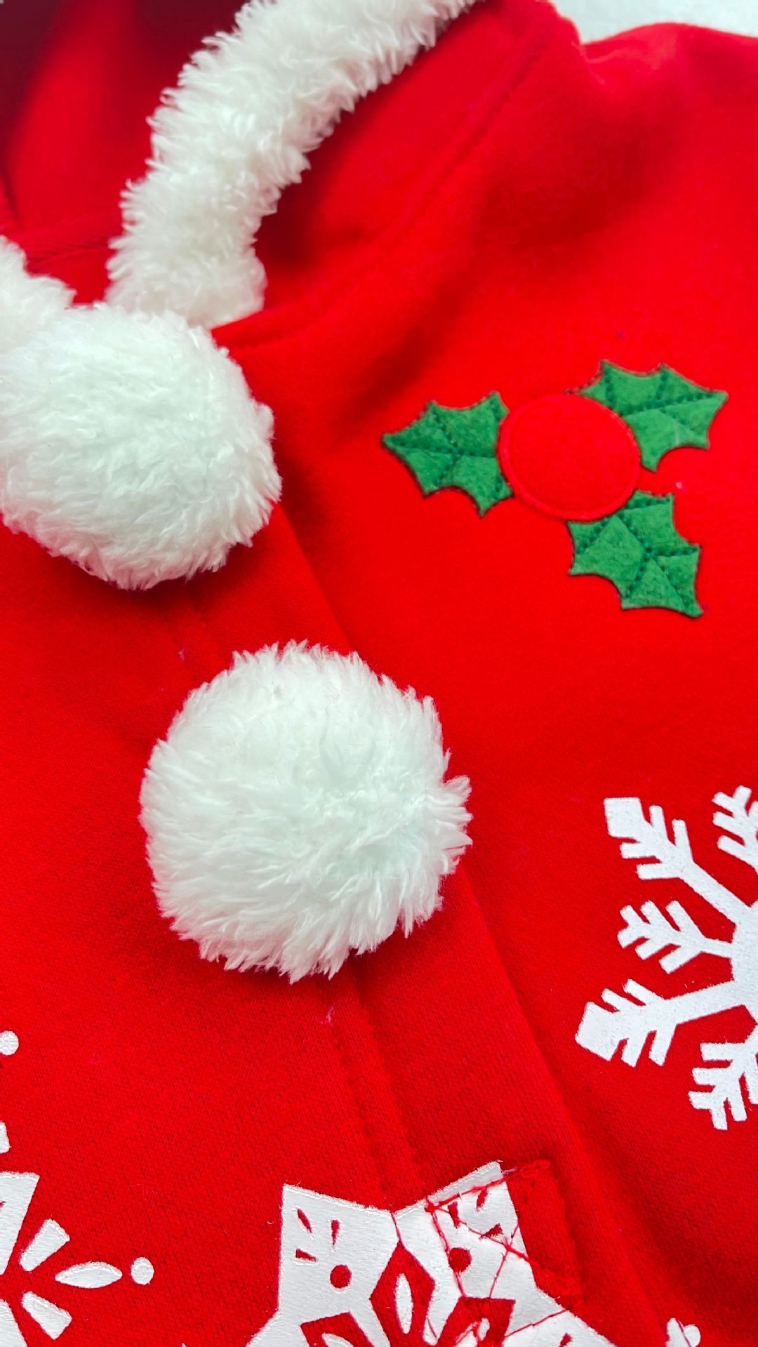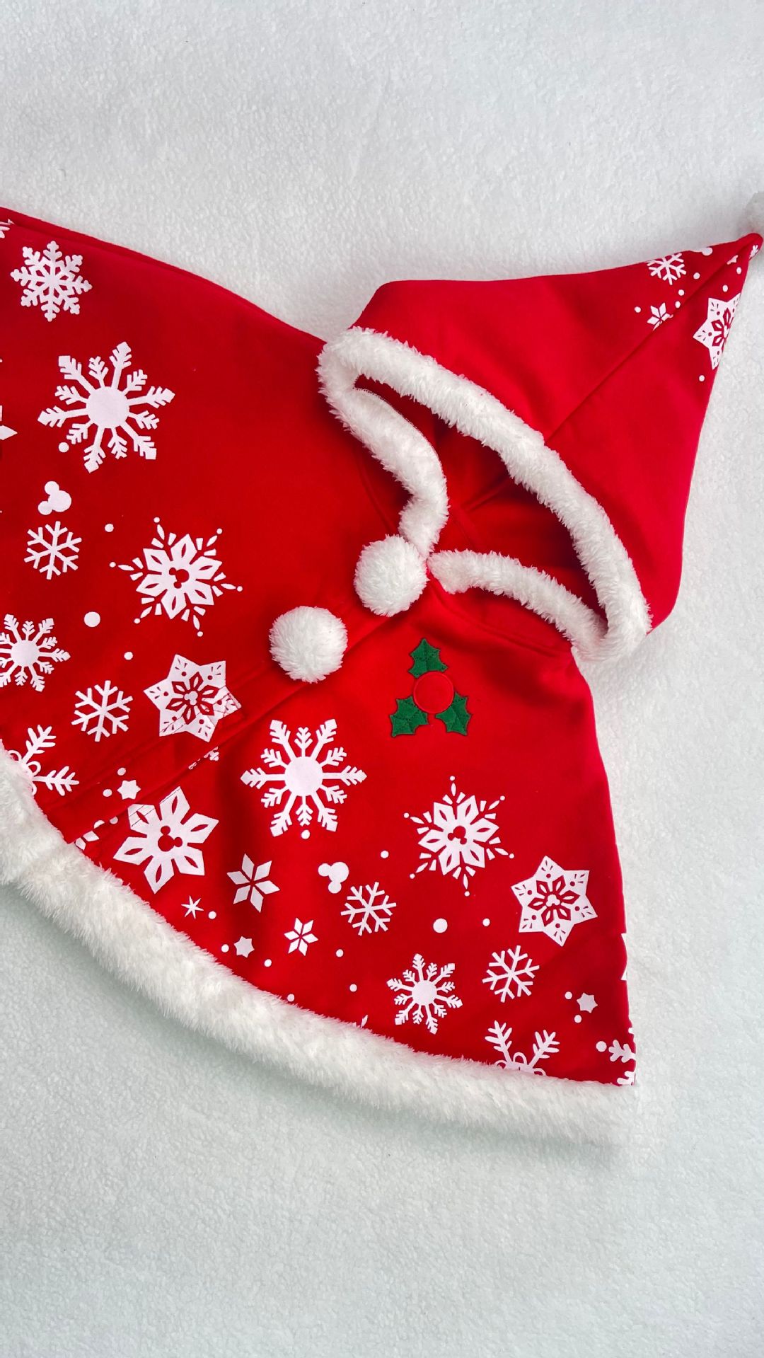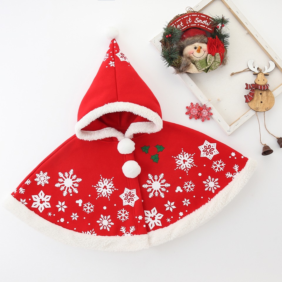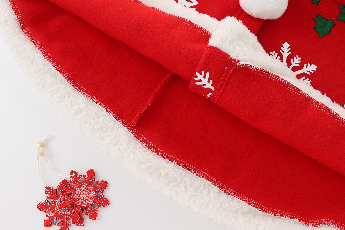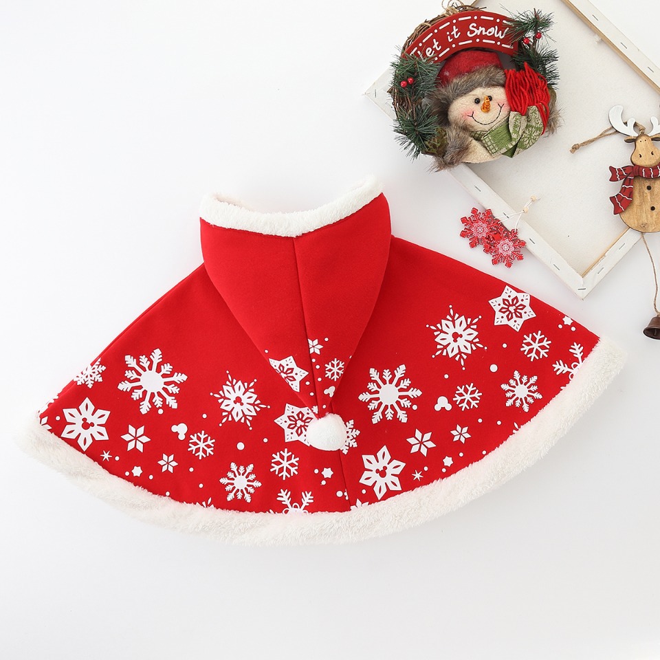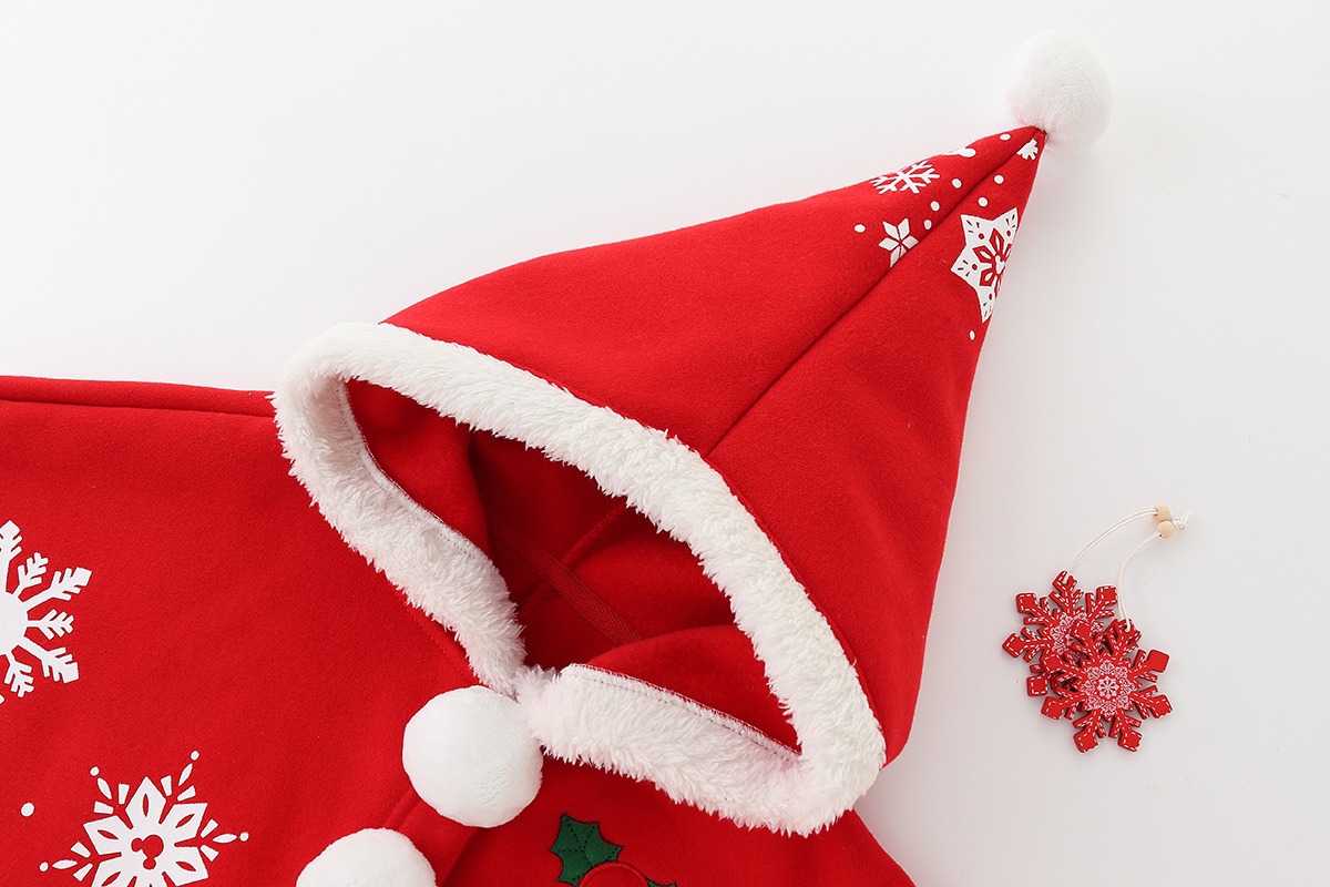 正红的斗篷色泽浓郁,超衬宝宝肤色,一眼吸睛。白色毛毛边柔软蓬松,细密的质感如云朵轻裹,萌趣毛球随着宝宝蹦跳摇曳生姿,每一步都灵动俏皮。精致雪花图案,是圣诞的专属浪漫,印染清晰,经多次洗涤也不褪色、不变形。