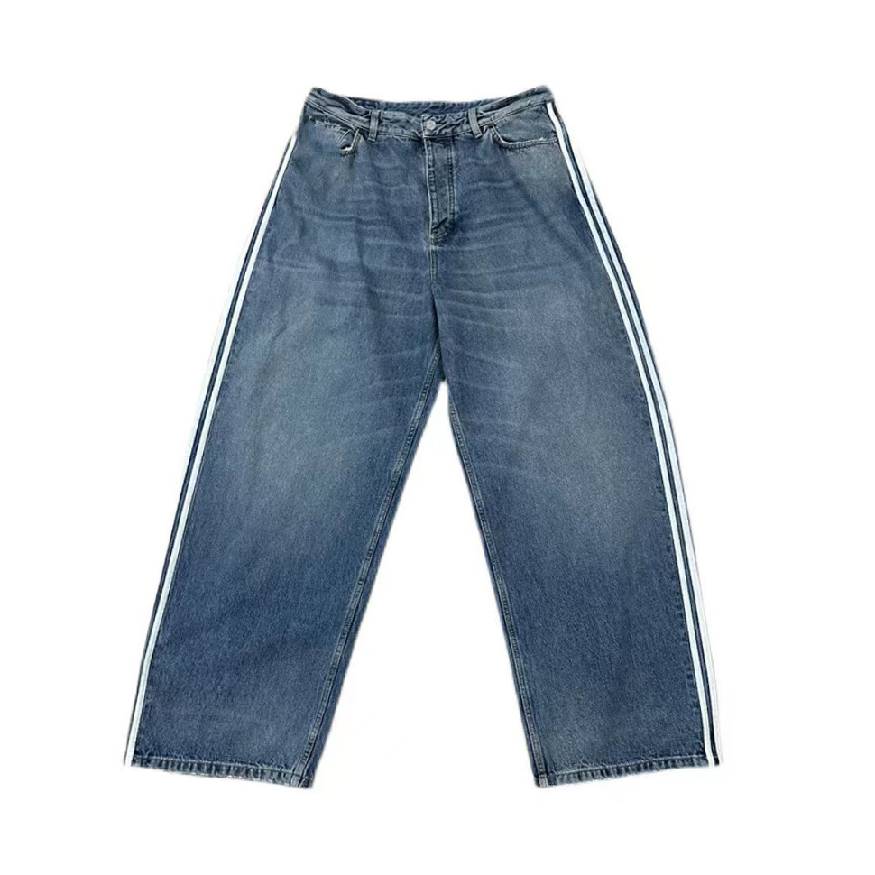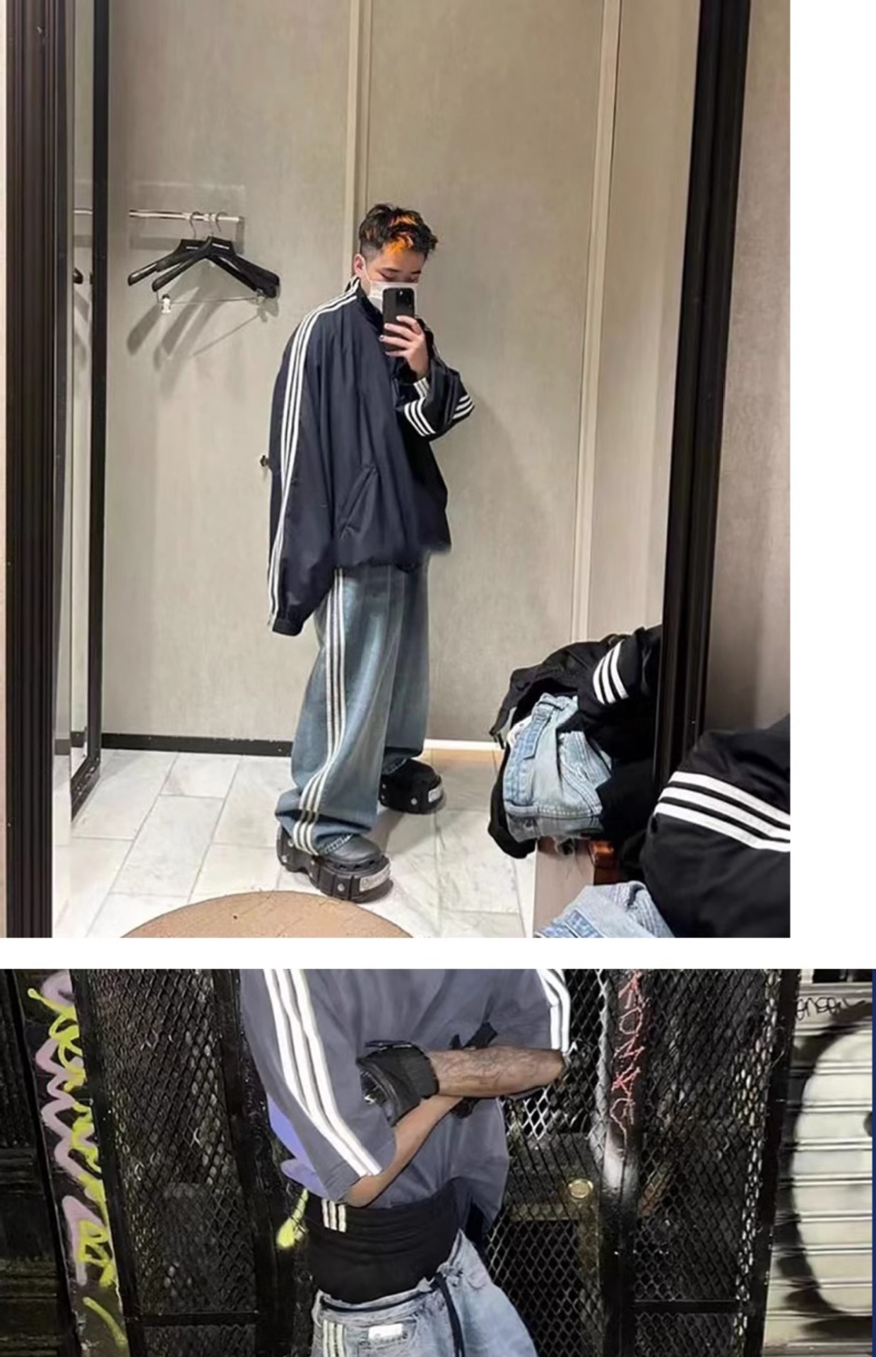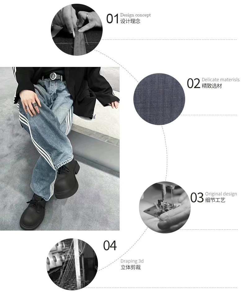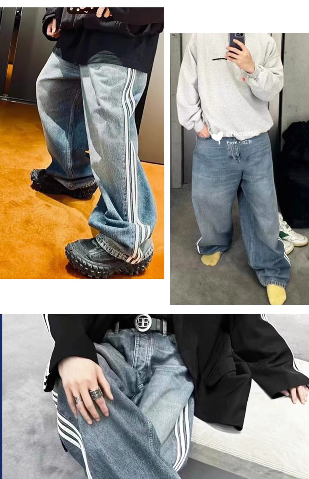 홍콩 스타일 거리 가을 새 줄무늬 청바지 3 바 세척 프로필 블루 와이드 레그 스트레이트 청바지 남성용스토어 가기
