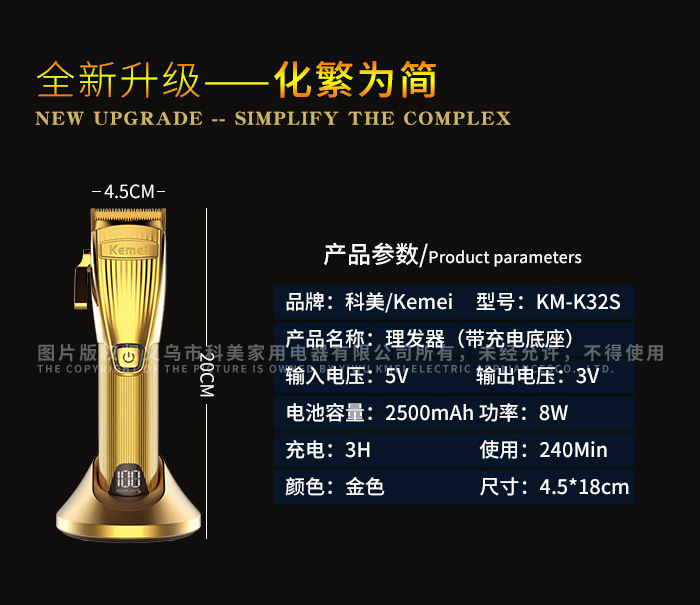 헤어 살롱을위한 고출력 전기 헤어 클리퍼를 KM-K32S 충전베이스가있는 국경 간 코미 헤어 클리퍼 전기 면도기