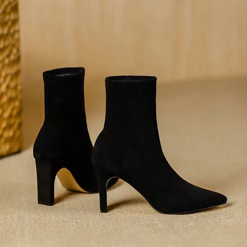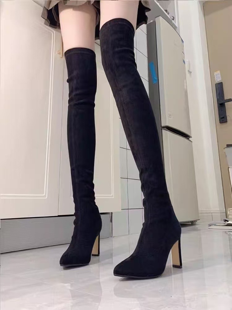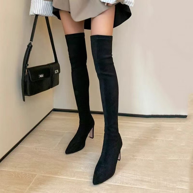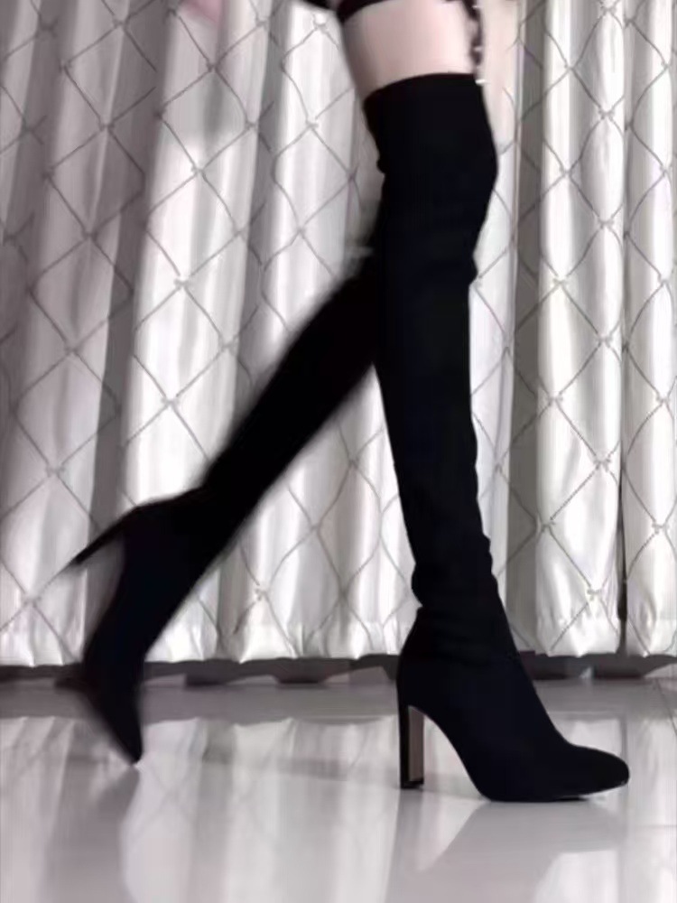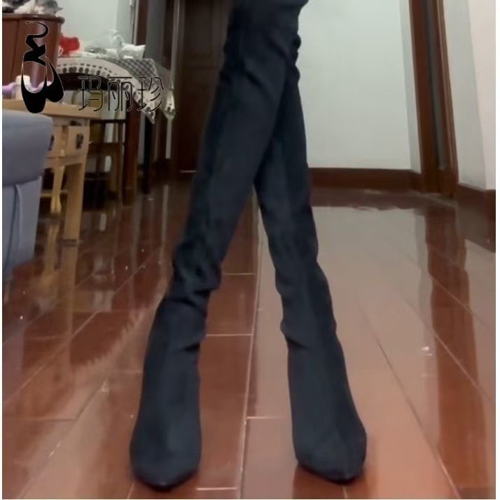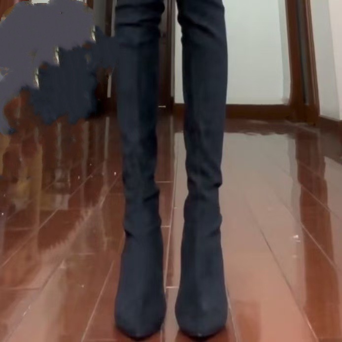 여자 롱 부츠 2024 뉴 스웨이드 섹시 슬리밍 짧은 무릎 롱 부츠 뾰족한 두꺼운 힐 스트레치 얇은 부츠스토어 가기