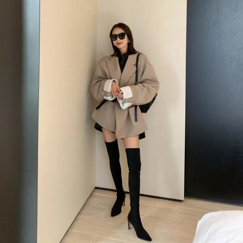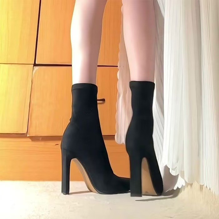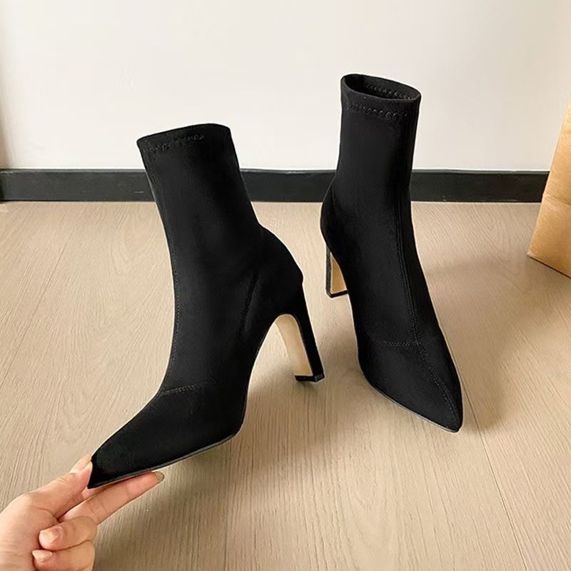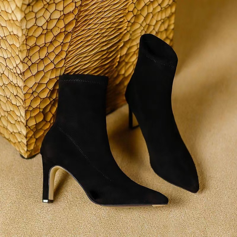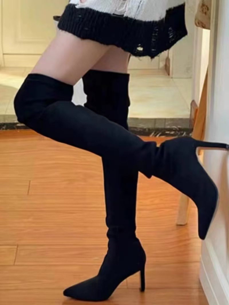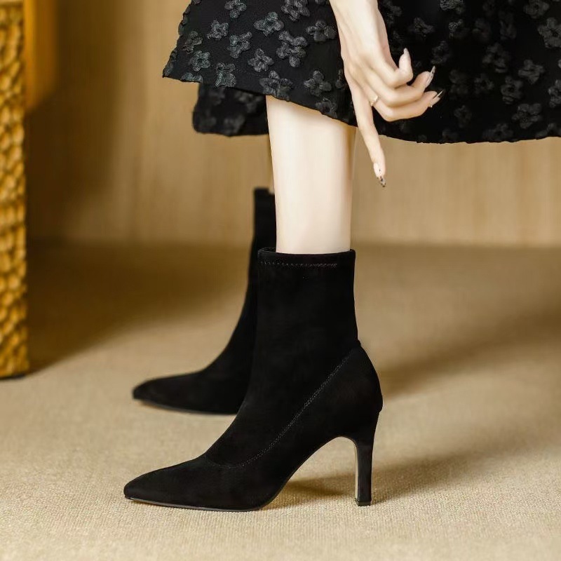 여자 롱 부츠 2024 뉴 스웨이드 섹시 슬리밍 짧은 무릎 롱 부츠 뾰족한 두꺼운 힐 스트레치 얇은 부츠스토어 가기