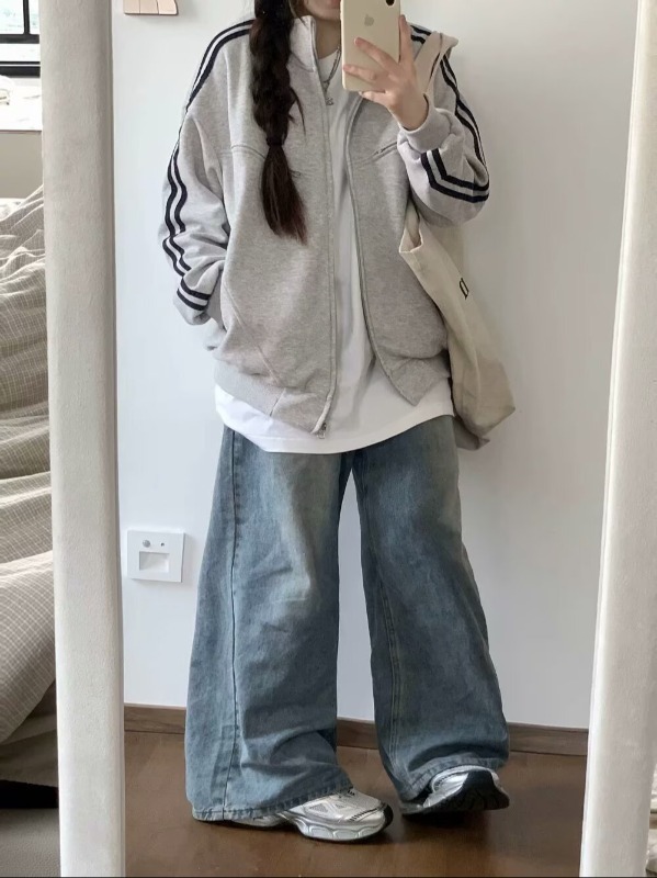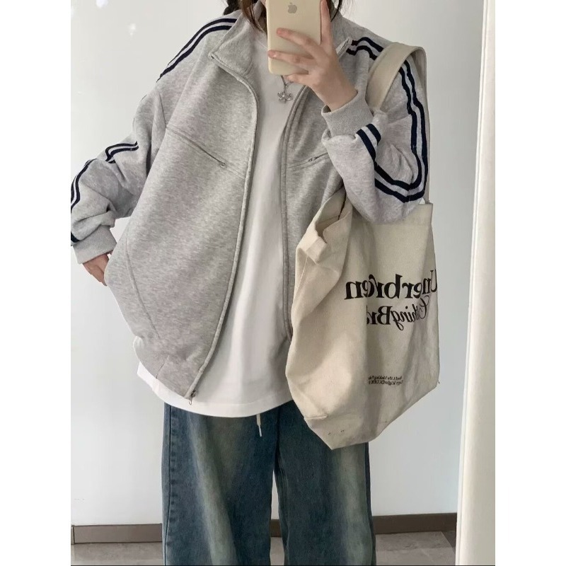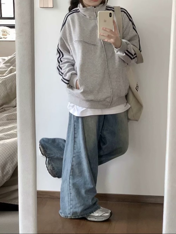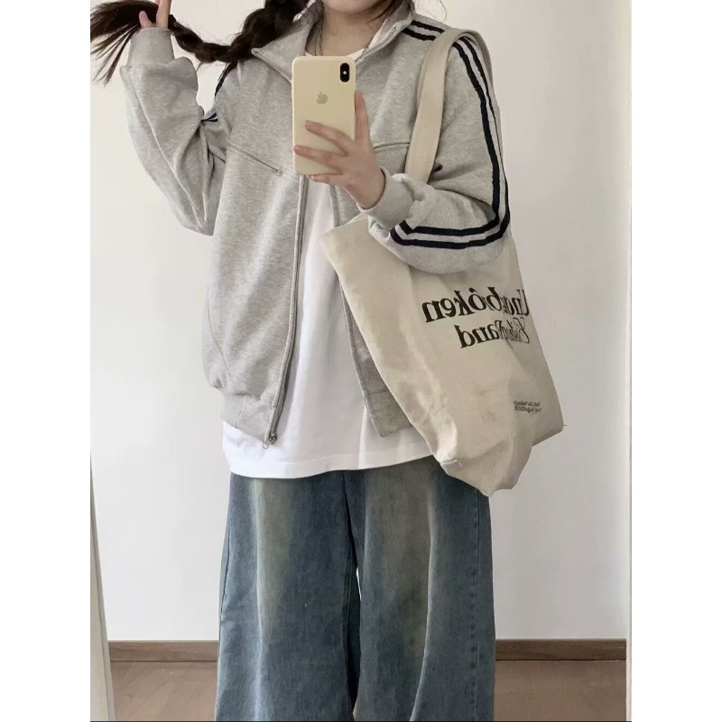 아메리칸 스타일 레트로 중립 스타일 야구 세트 스웨트 코트 여성의 봄과 가을 느슨한 게으른 스타일 수직 칼라 재킷 여성용 탑
