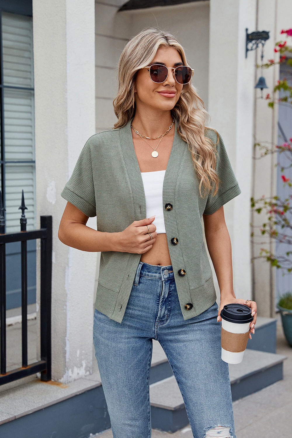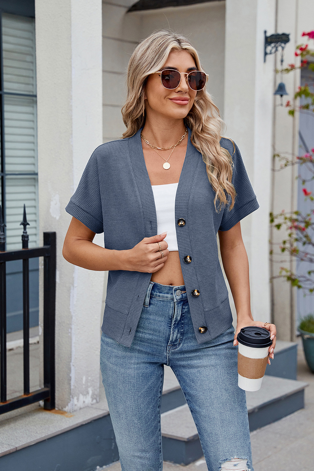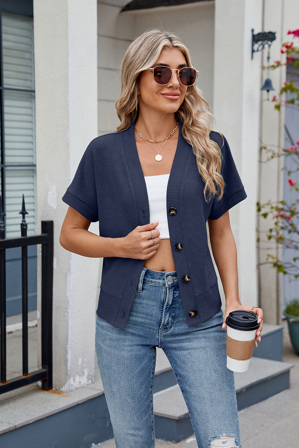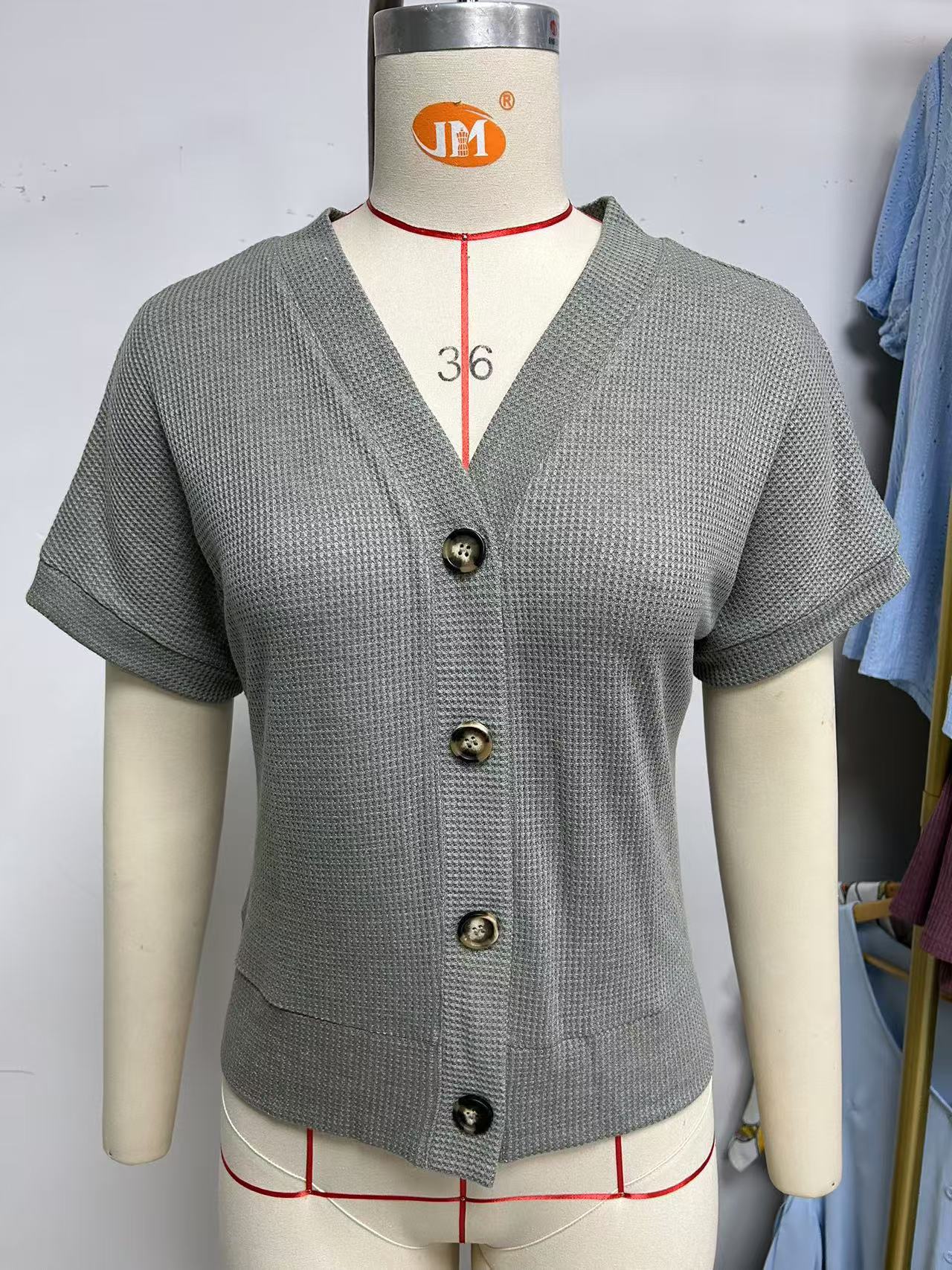 아마존 유럽과 미국 국경 대외 무역 2025 봄과 여름 새로운 와플 캐주얼 V 넥 니트 버튼 짧은 소매 카디건스토어 가기