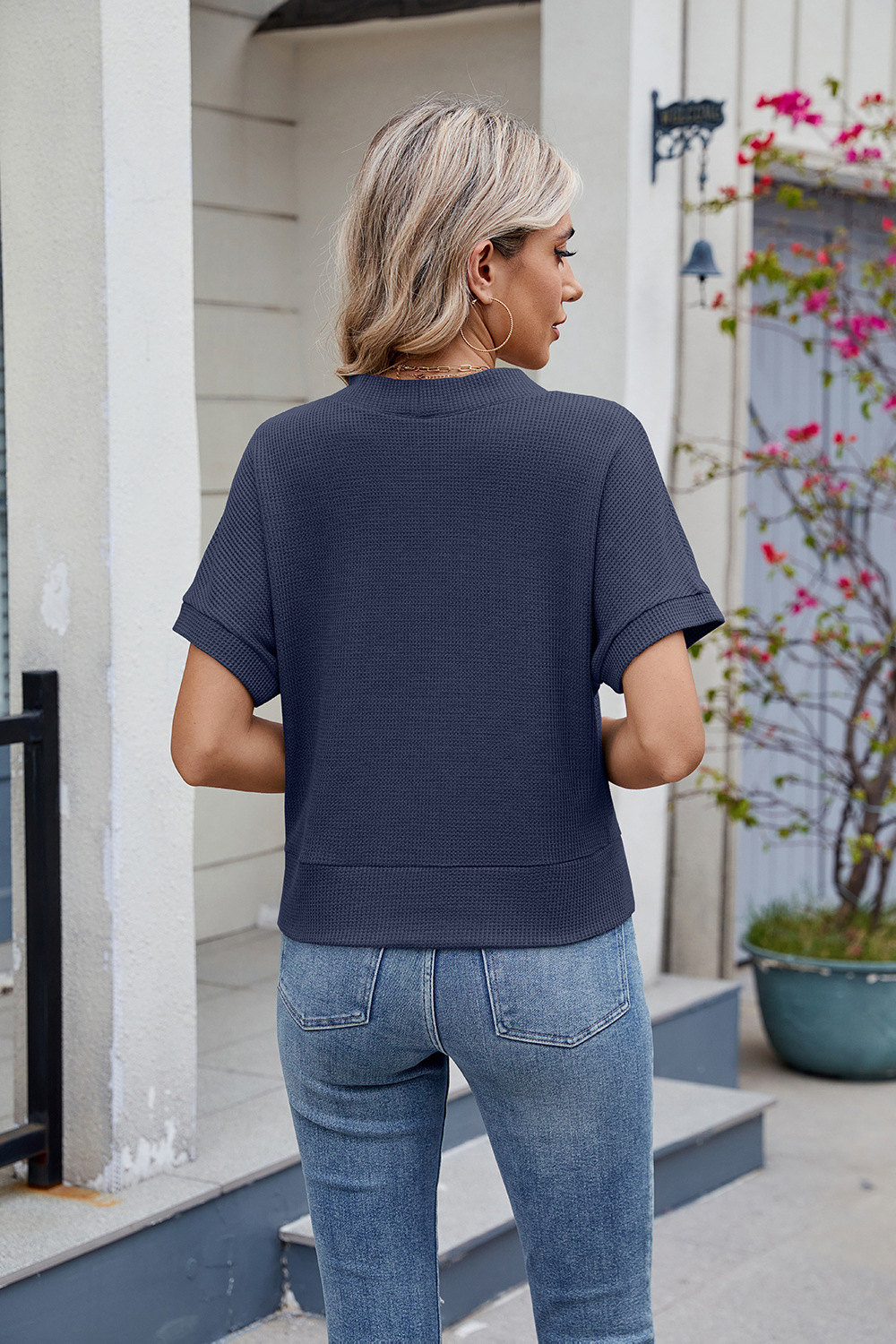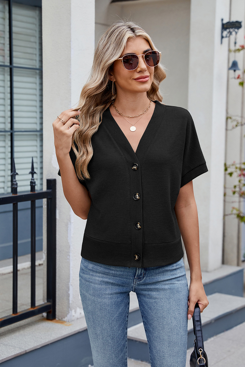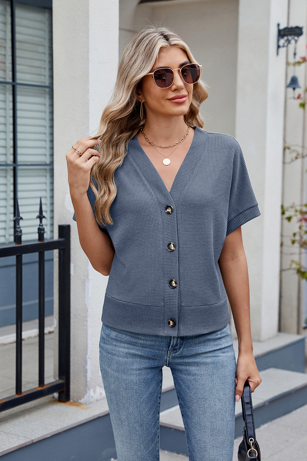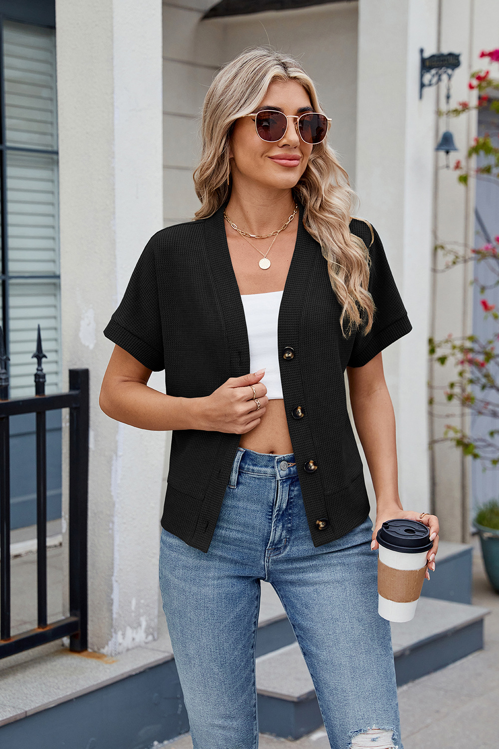 아마존 유럽과 미국 국경 대외 무역 2025 봄과 여름 새로운 와플 캐주얼 V 넥 니트 버튼 짧은 소매 카디건스토어 가기