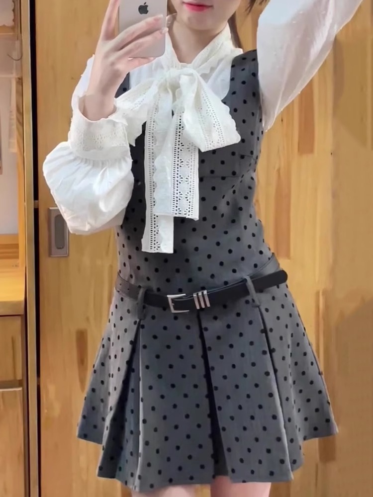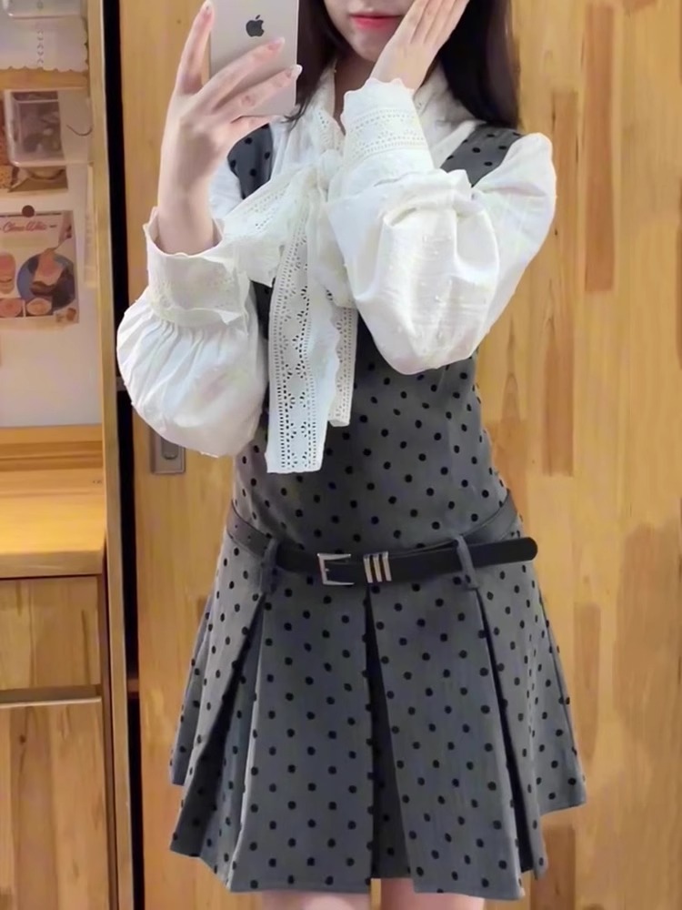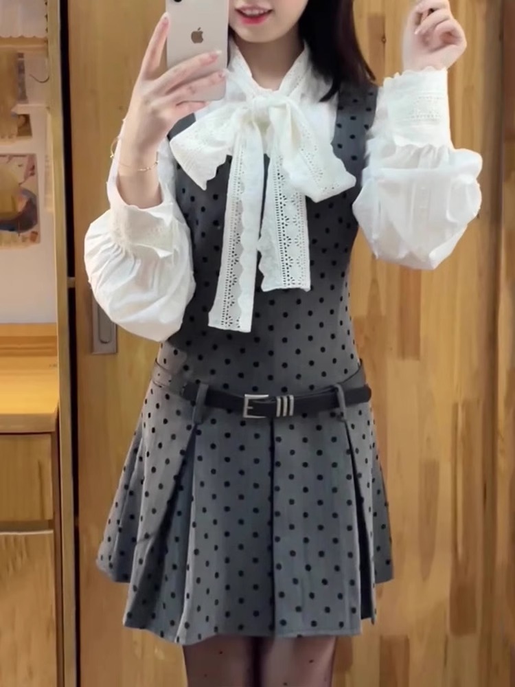 대학 스타일의 분위기는 작은 남자를위한 여성용 가을 흰 셔츠 웨이브 포인트 주름 치마 투피스 세트의 전체 세트 착용합니다.스토어 가기
