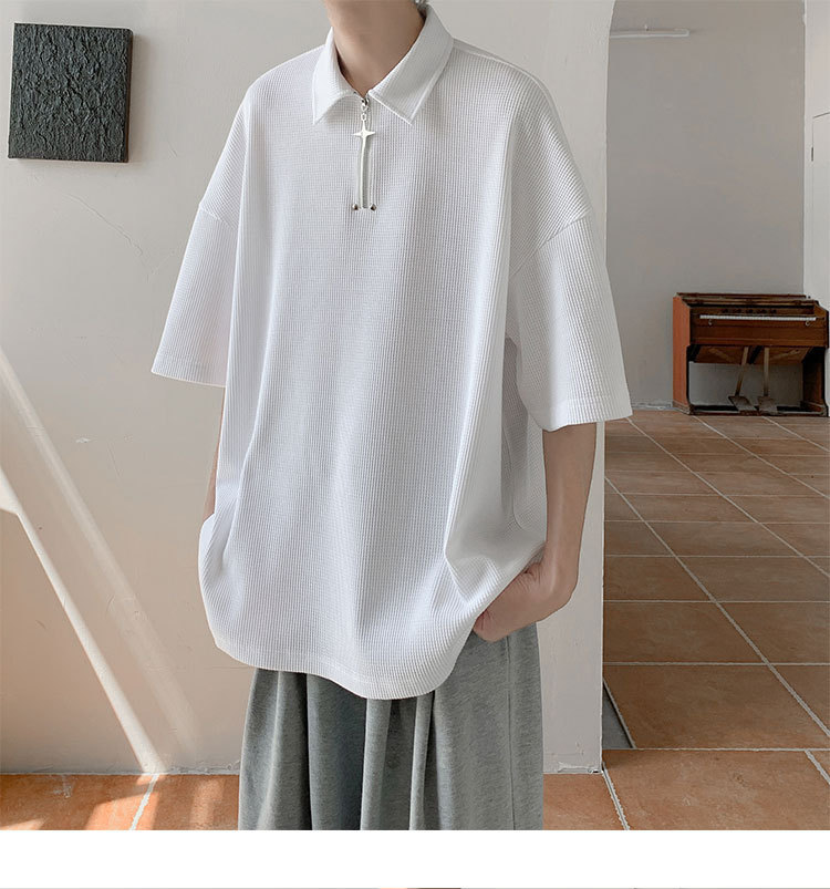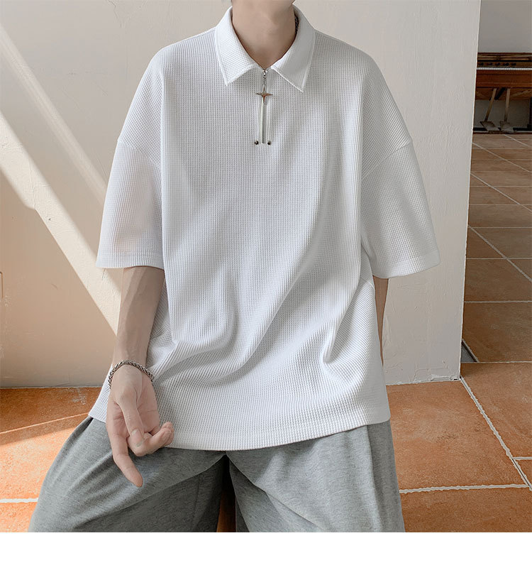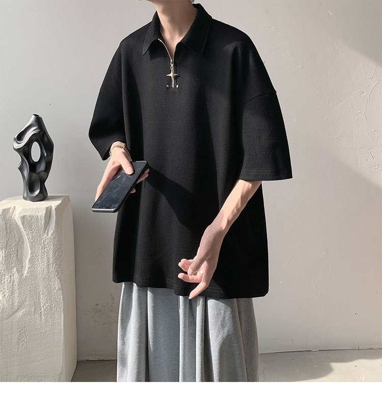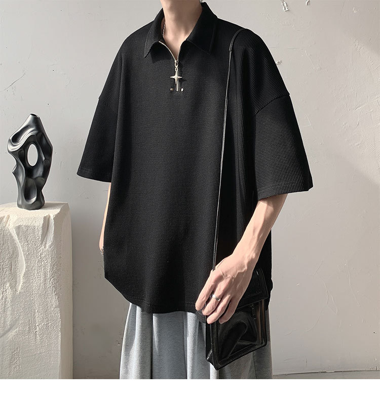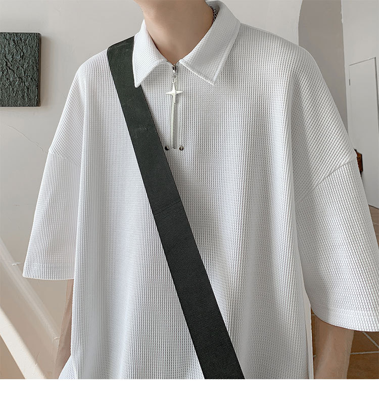 와플 폴로 셔츠 남자의 여름 느슨한 캐주얼 솔리드 컬러 라르 최고의 미국 스타일 패션 브랜드 하프 지퍼 짧은 소매 티셔츠