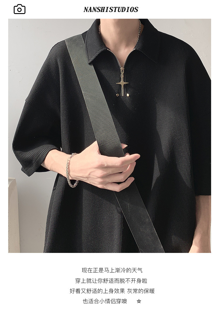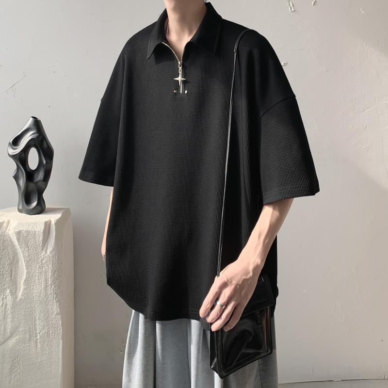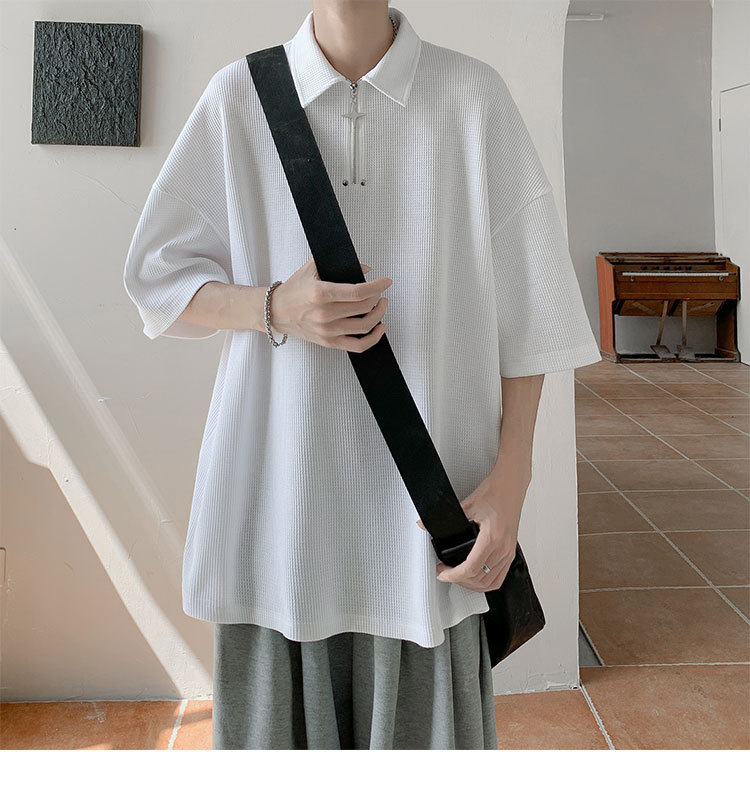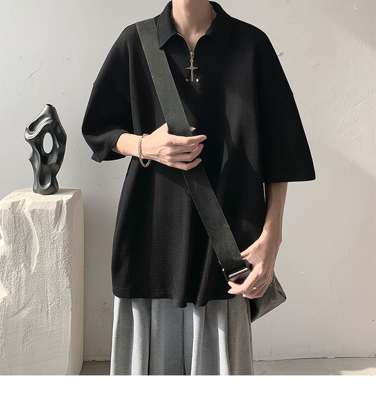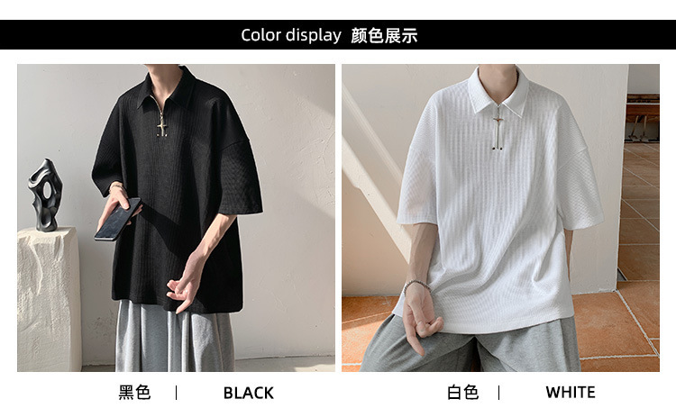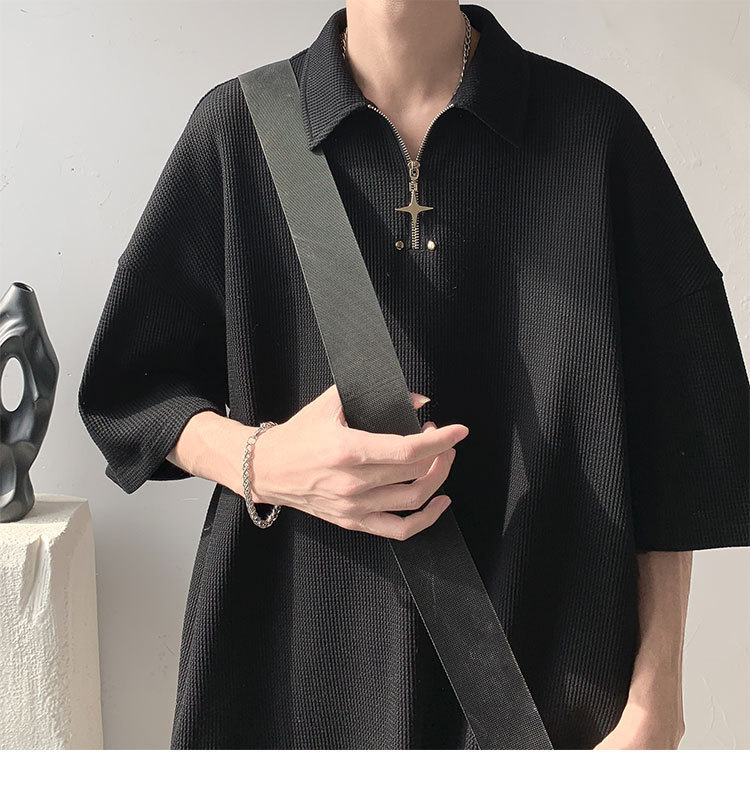 와플 폴로 셔츠 남자의 여름 느슨한 캐주얼 솔리드 컬러 라르 최고의 미국 스타일 패션 브랜드 하프 지퍼 짧은 소매 티셔츠