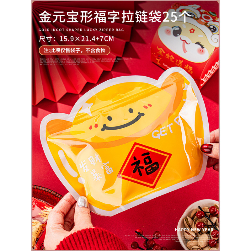 • "Fu"라는 단어가 새겨진 금괴 모양의 지퍼백 25개