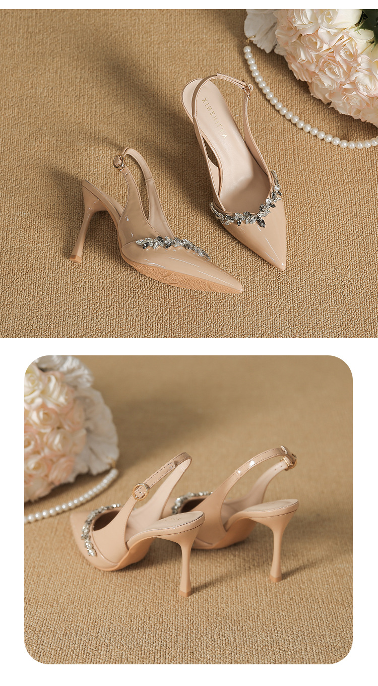 프랑스 누드 특허 가죽 백 빈 신발 새로운 뾰족한 섹시한 모조 다이아몬드 트림 여성을위한 아름다운 기질 올 매치 하이힐