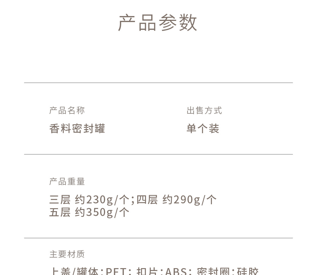 香料收纳盒 颜色:暖灰色 装箱数:1个150pcs;3个装:80pcs;4个装:60pcs;5个装:40pcs;箱规分别 64.5 45 36.5cm. 54 50 61.5 cm. 54 49.5 61cm.