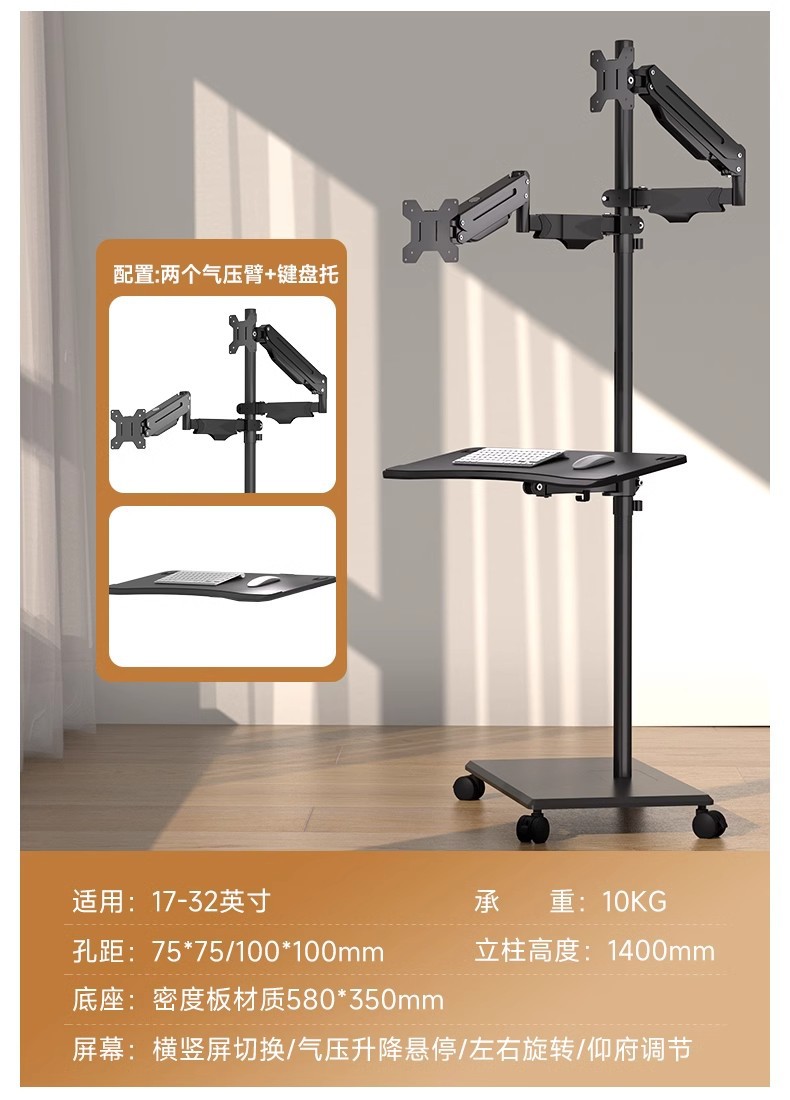 • 듀얼 스크린 공기압 암 + 키보드 트레이 플로어 스탠딩 이동식 17-32inch