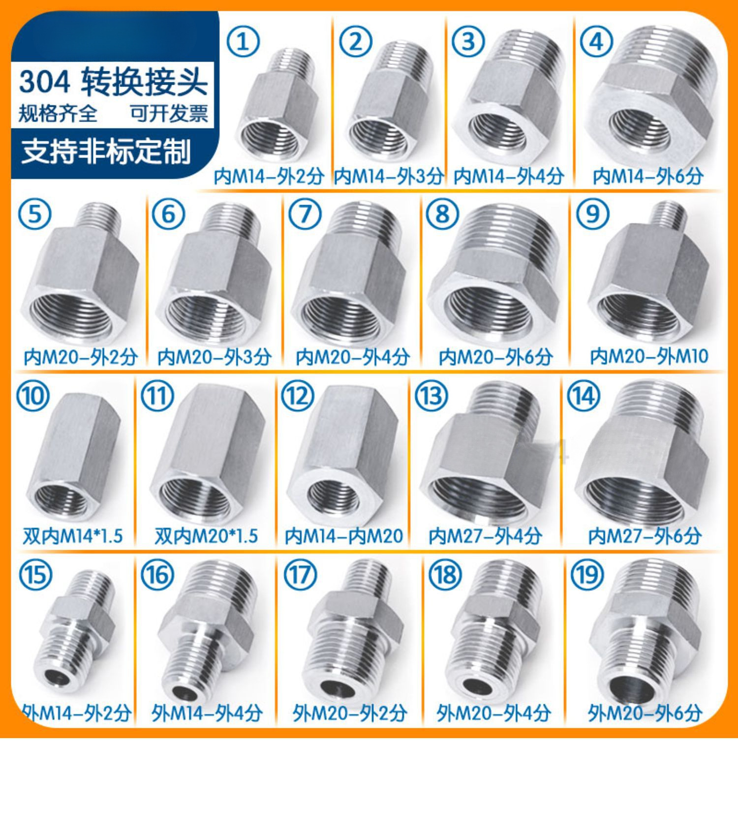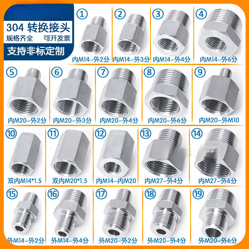 304 스테인레스 스틸 어댑터 메트릭 M14M20 ~ 인치 4 포인트 26 압력 게이지 튜브 내부 및 외부 와이어 코어 농축스토어 가기