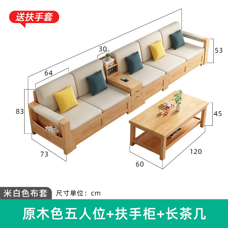 • 우드 컬러 [5인승 + 팔걸이 수납장 + 롱 커피 테이블] - 오프화이트 천 커버